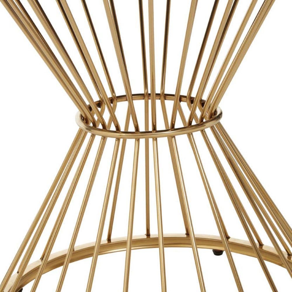 Item Code: 5527691 The Anzio dining table with black glass top and gold finish metal base features a sleek wireframe that gently forms imagery of an hourglass.This contemporary dining table features a sleek wireframe that gently forms imagery of an hourglass. Intricately handcrafted from metal in the gold effect finish, this round table is topped with a black glass that contributes to its luxe visual aesthetic.