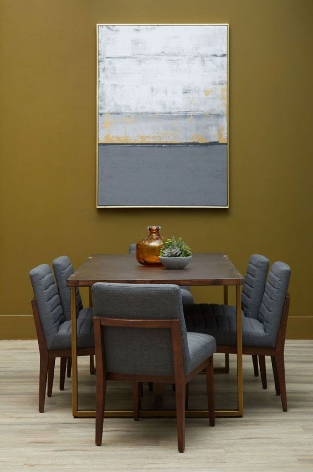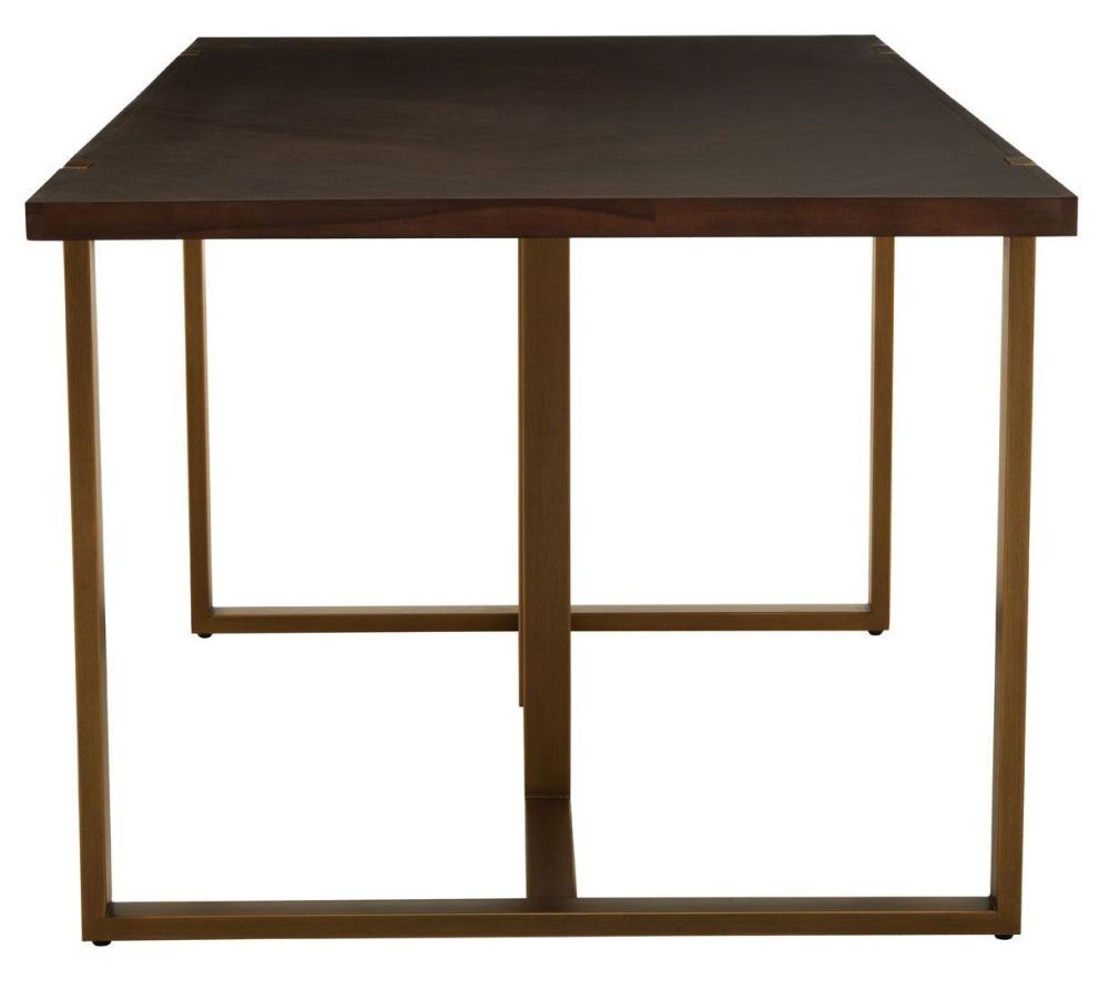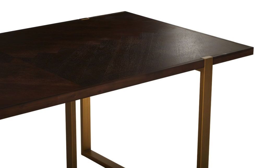 Item Code: 5529084 This dining table with sustainable sourced acacia wood top has a clean, sledge base in antique brass base that creates a modern look.The rectangular top of this dining table is carved from eco friendly acacia wood featuring a chevron pattern in light and dark grain variations. Antique brass finish metal legs with an elegant geometrical appearance keep the rustic tabletop in place and contrast the warmth of natural wood.