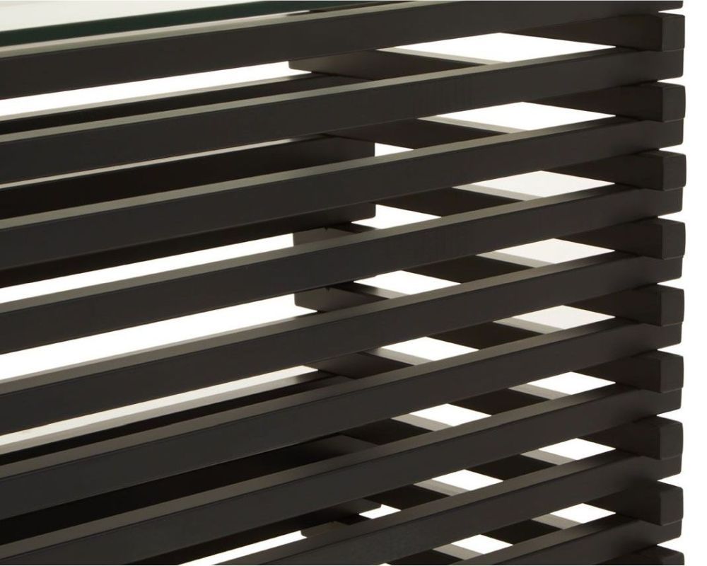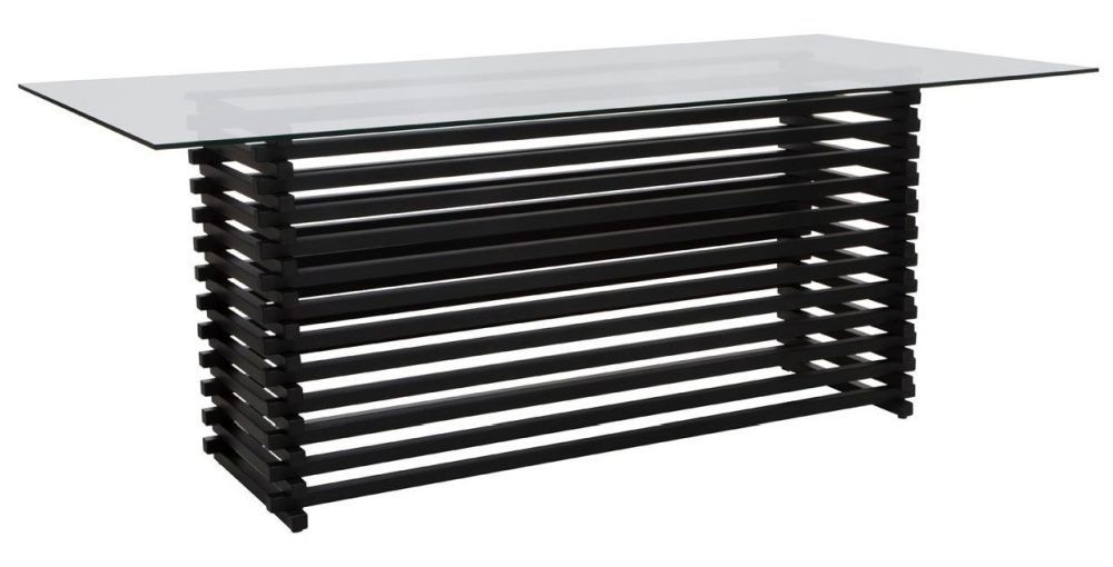 Item Code: 5529537 The Vogue dining table exudes modern retro opulence. The clear glass table top is supported by a matte black stainless steel base.The Vogue dining table has a strong art deco influence, with bold geometrical features balanced by a harmony between materials. The base is crafted from strong matte black stainless steel, supporting a large rectangular glass table top.