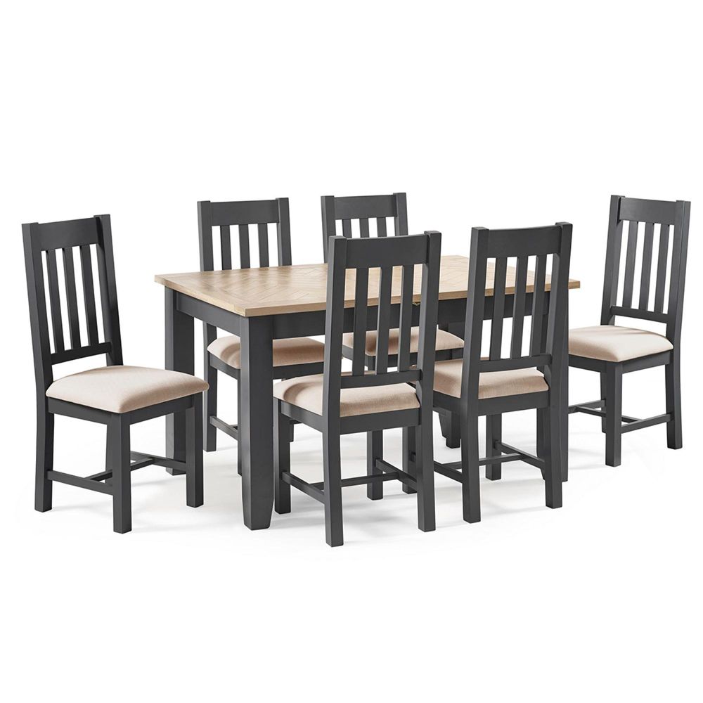 Item Code: BOR101 Designed exquisitely, the Bordeaux Dining Set is finished in a beautiful grey shade that will complement various existing decor styles. The parquet tops detailing leaves an elegant and rustic feel the perfect way to make your house feel like a home. This classic dining table features a 40cm butterfly extension system that is easy to use and stores within the table when not in use.