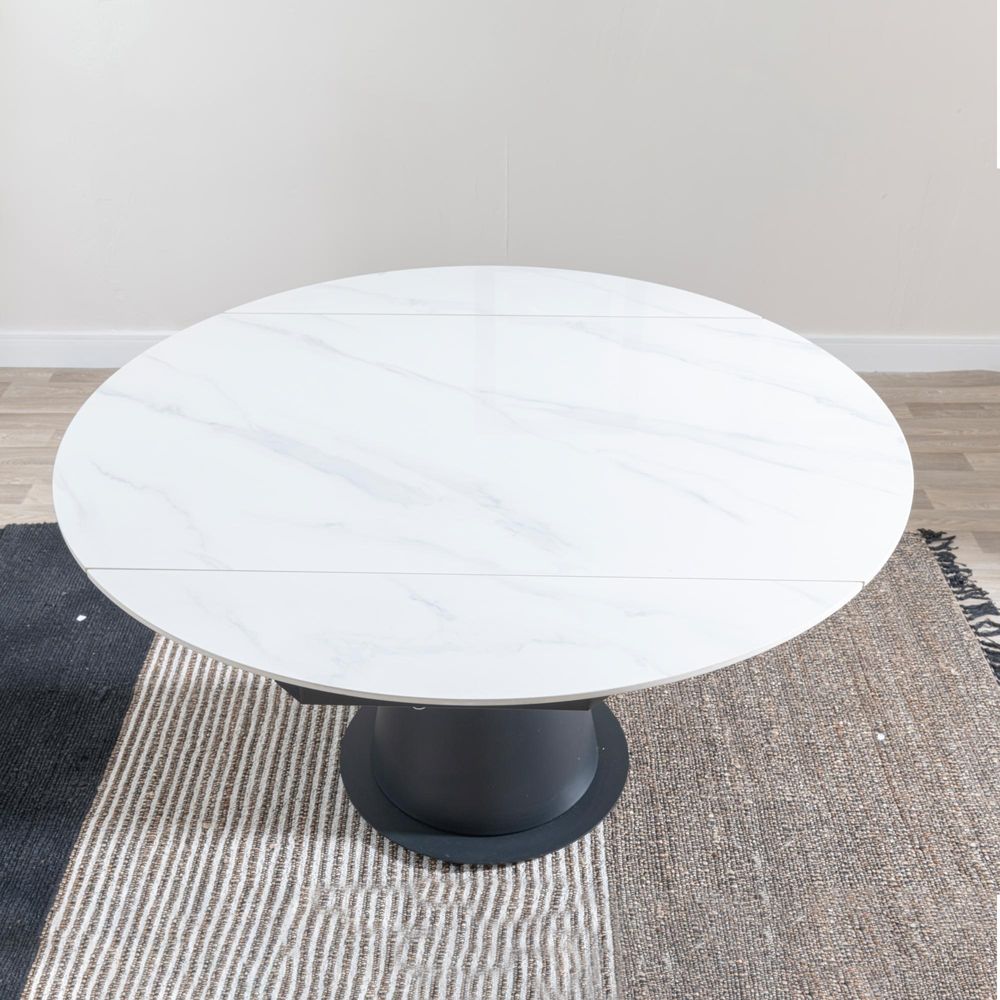 Sleek white ceramic top - 135cm diameter - offers a clean, contemporary look.