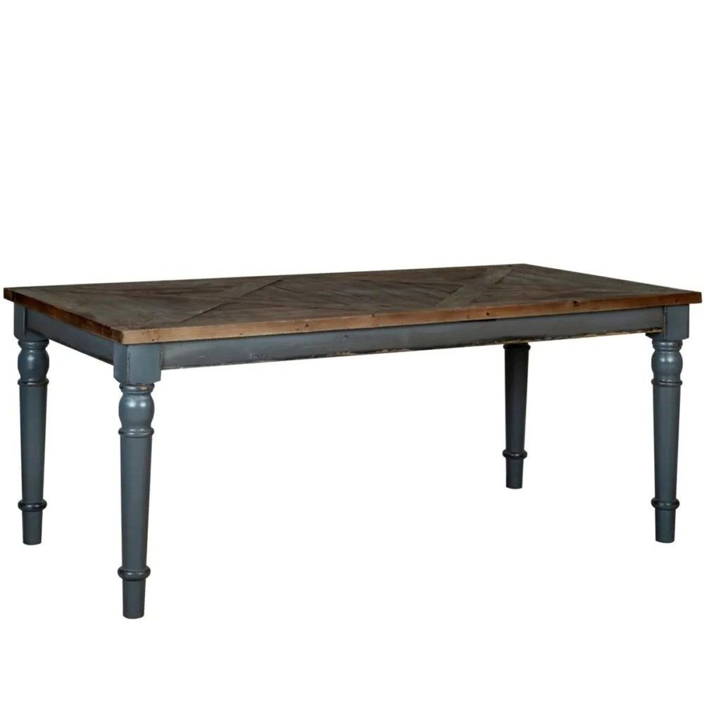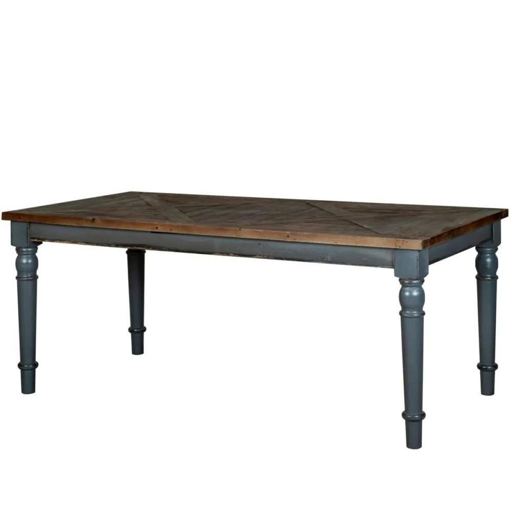 The tabletop is crafted with individual timber planks, arranged in an ornate cross design that adds depth and detail while highlighting the beauty of natural reclaimed wood. Finished in a rich dark Dove grey paint with lacquered pine tops, the table strikes the perfect balance between rustic warmth and refined elegance. Its sturdy frame and generous proportions ensure it is as practical for everyday use as it is impressive for special occasions.