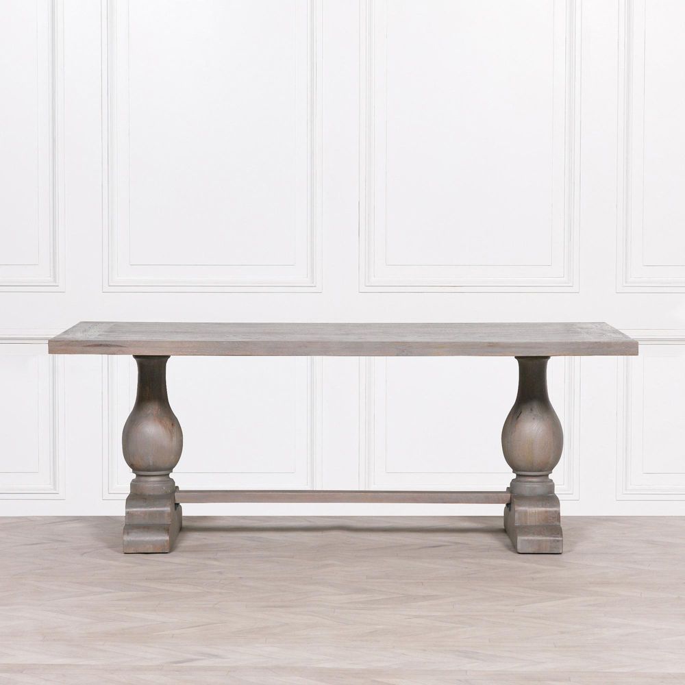 Item Code: KFA931 Rectangular 210cm dining table handcrafted from mango wood in a rustic wood finish with subtle grey wash over the wood. The table has hand-carved detailed columned base pedestals.
