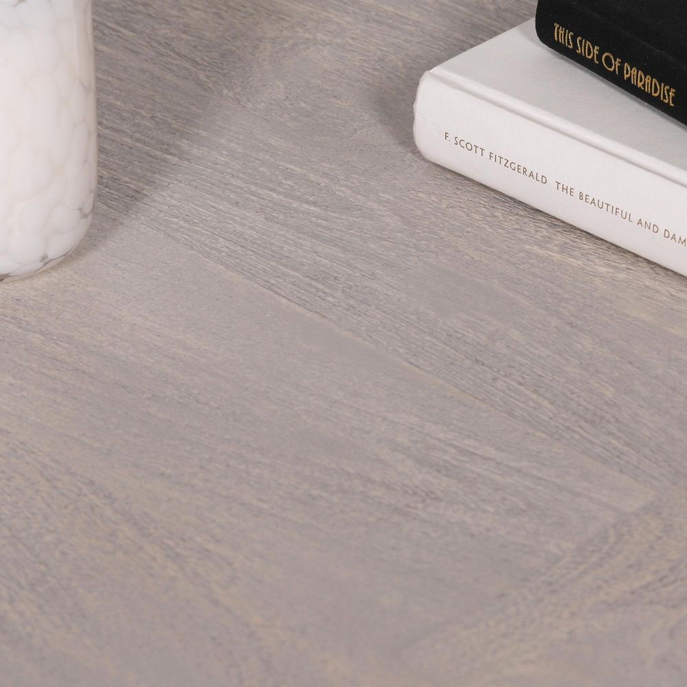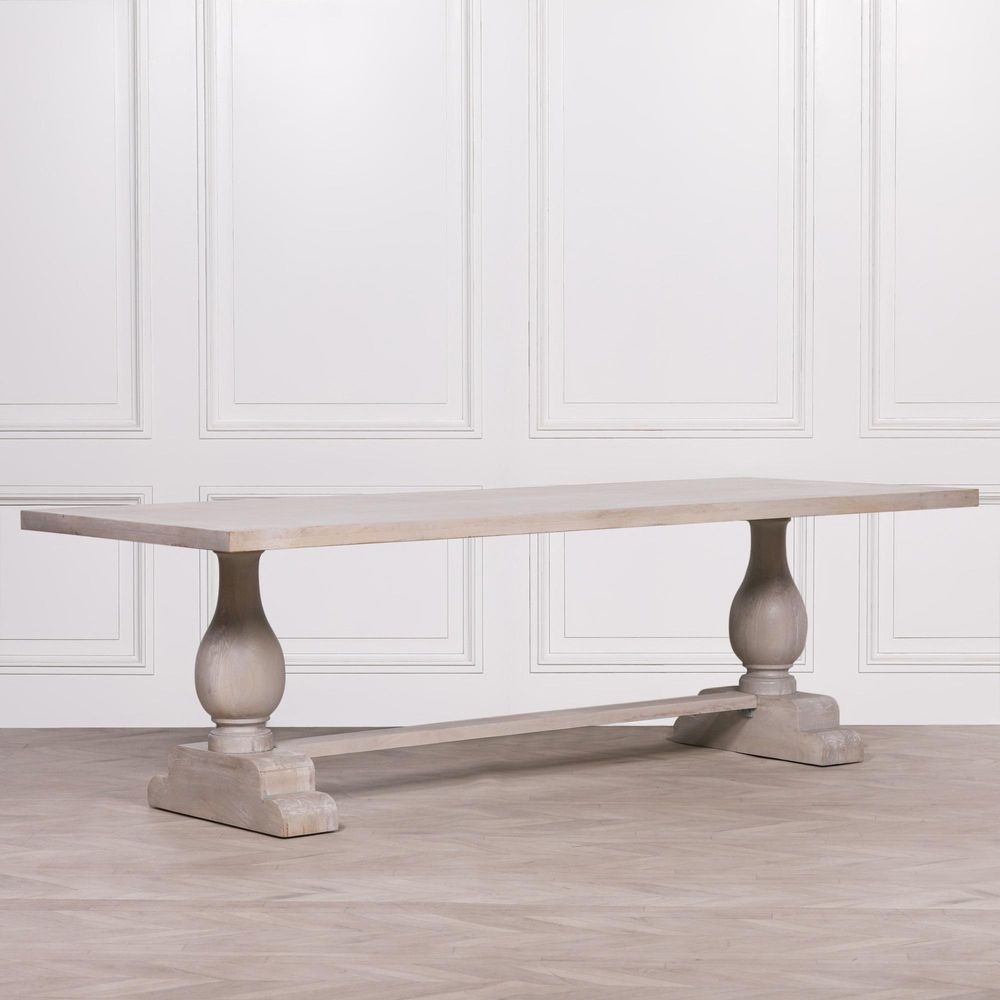 Item Code: KFA941 Rectangular 260cm dining table handcrafted from Linda mango wood with a light grey rustic wash. The table has hand-carved detailed columned base pedestals.