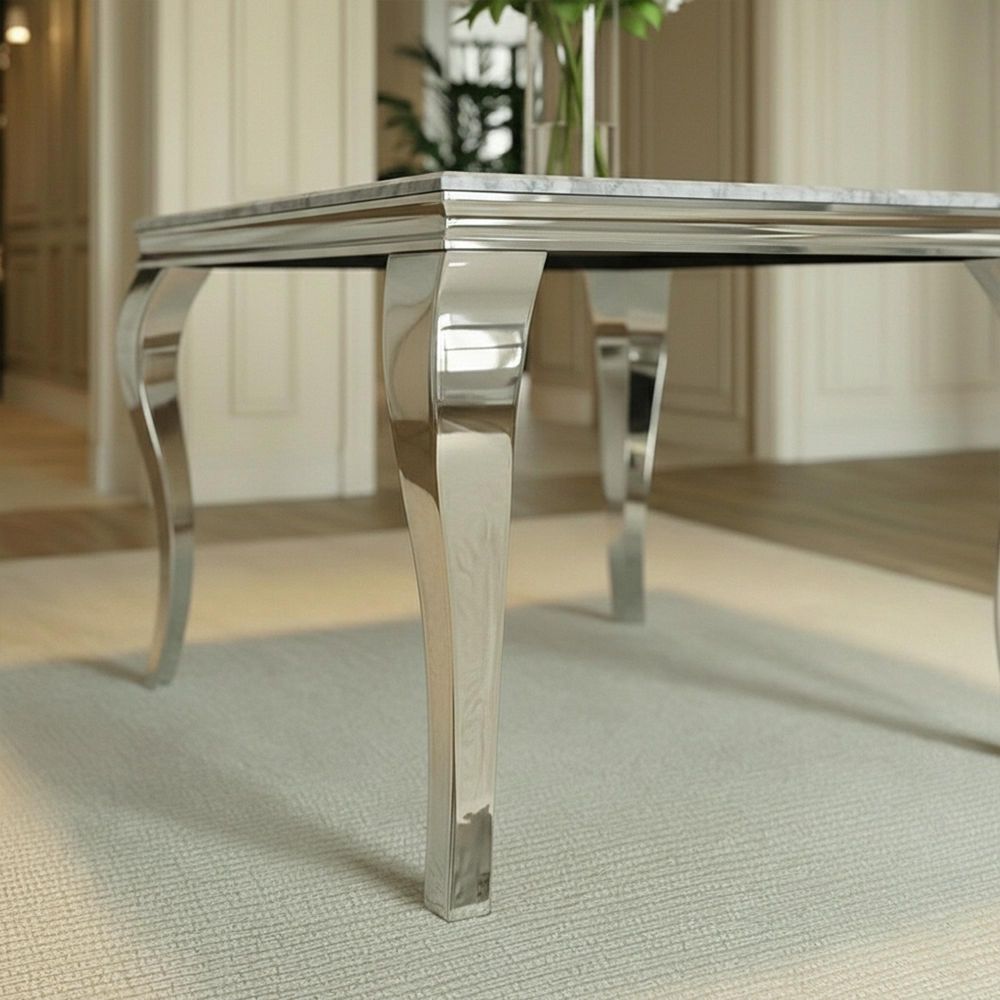 Crafted with a sophisticated, minimalist aesthetic, this square dining table features a luxurious grey marble tabletop with a high-gloss finish that radiates upscale charm. Its standout stainless steel Cabriole legs, finished in polished chrome, offer a nod to classic design with a modern twist, adding sculptural grace and exceptional stability.