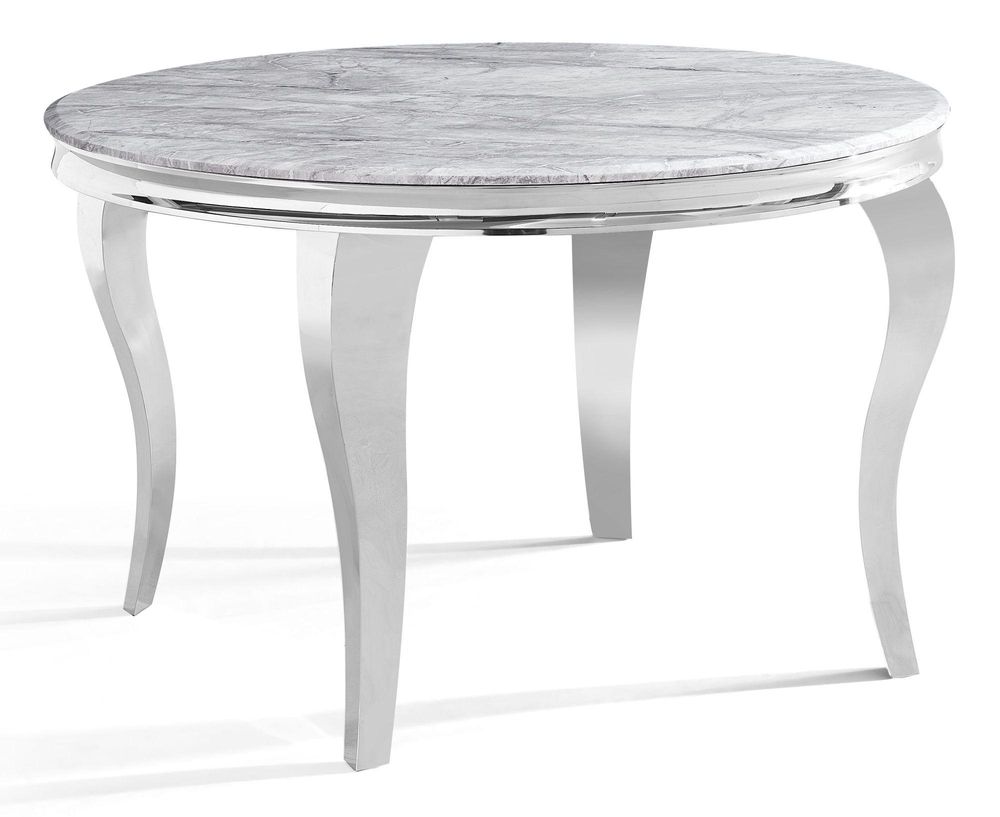 The round grey marble tabletop, featuring a high-gloss finish, adds a touch of understated luxury, while the sculptural stainless steel Cabriole legs with a sleek chrome finish make a bold design statement. At 120 cm in diameter, this table comfortably seats four, making it ideal for both everyday meals and intimate gatherings.