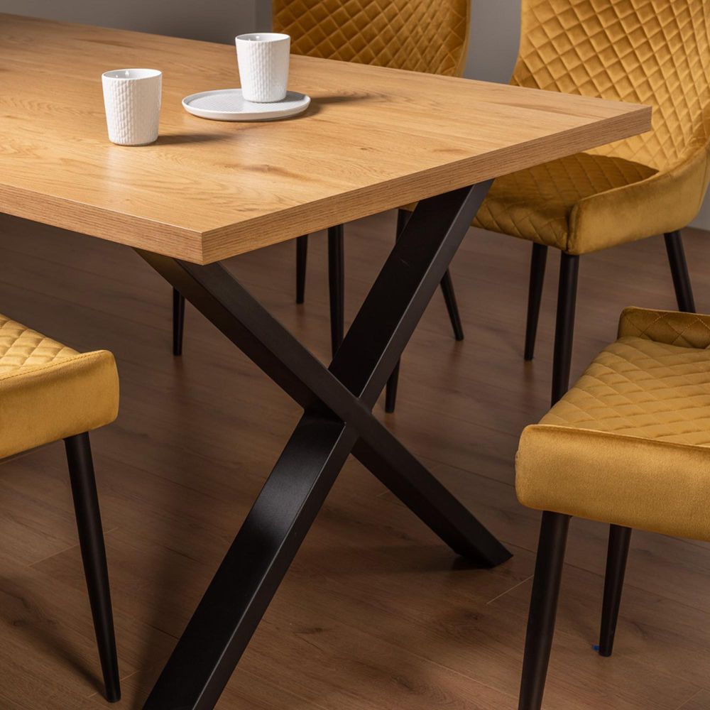 Item Code: H5100-4-LX The Ramsay X leg, six-seater table offers practicality and style in one, making it the perfect addition to your dining space. With a hard-wearing melamine tabletop, finished in a rustic oak effect, this design considers longevity and function so that you can enjoy mealtimes with family and friends for years to come. Set upon two X-shaped rectangular metal legs, finished in a sand black powder coating, the Ramsay combines industrial and bold materials with those that feel natural and organic, resulting in a contemporary dining range for your home.