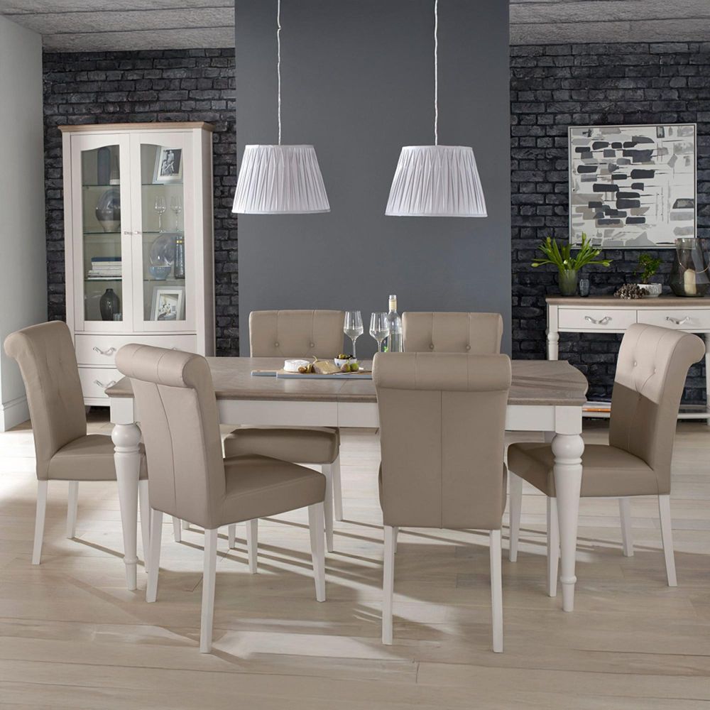Item Code: 6290-2 With drama and sophistication in abundance, Montreux boasts beautiful form by way of serpentine framed tops, gently bow-fronted cabinet & classically styled turned legs. Bespoke handles, intricate oak marquetry tops and large roll back upholstered chairs all add to the uncompromising design detail which together with the combination of striking grey washed oak tops contrasting with soft grey pigment frames will ensure this range makes a striking statement in any home. Quality touches such as soft closing drawers for the cabinet and reciprocal extension runners for the dining tables epitomise the best of contemporary styling and everyday use.