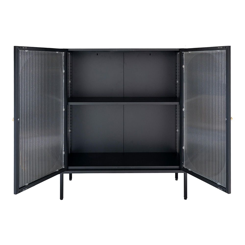 Crafted from durable steel with a smooth black finish, the cabinet’s structure exudes strength while maintaining a sleek, streamlined appearance. The airy mesh-style metal doors introduce subtle texture, balancing lightness and depth within the design. Behind the wavy glass panels, adjustable shelves offer adaptable storage for a variety of items — from tableware and books to decorative accents — allowing you to keep your space organised without compromising on style.