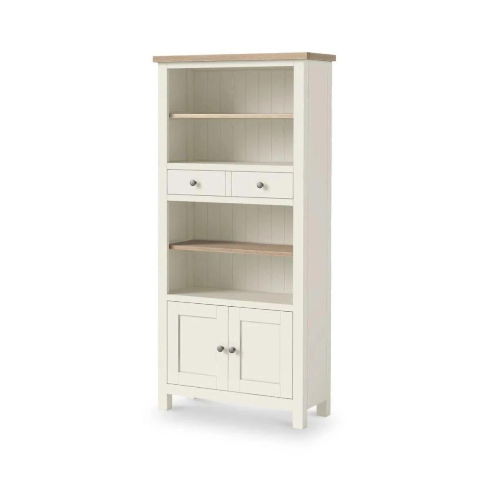 This display unit features four open shelves for books, décor, or collectibles, alongside two drawers and a cupboard for hidden storage of household essentials. Supported by sturdy block legs and constructed from solid wood and oak, it combines functionality with lasting durability.