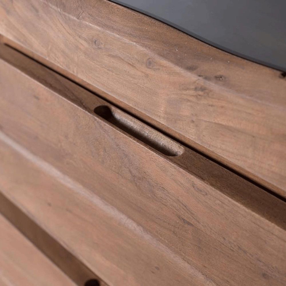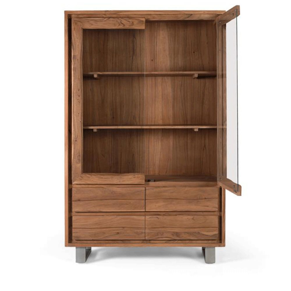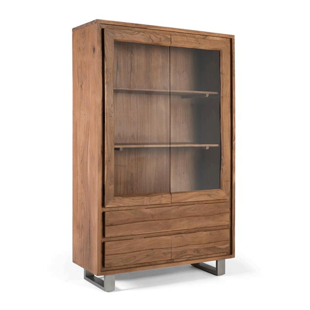 Item Code: 2231 Solid Acacia Wood Display Case With A Sleek, Modern Design. It Features Two Framed Glass Doors That Showcase Its Interior, Comprised Of Two Spacious Shelves. Below, There Are Four Large Drawers With Smooth Wood Fronts And No Visible Handles. It Rests On Straight Metal Legs, Giving It A Light, Industrial Feel, Contrasting With The Natural Warmth Of The Acacia Wood. Ideal For Spaces That Require Functional Storage With An Elegant Design, Such As Dining Rooms, Living Rooms, Or Offices.