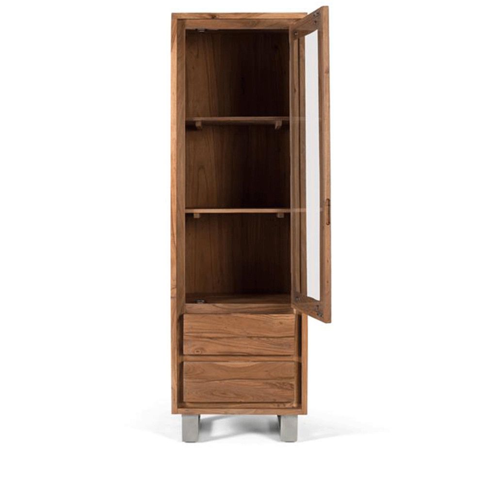 Item Code: 2232 Display Cabinet Made Of Solid Acacia Wood, With A Clean And Contemporary Design. It Features A Glass Door With A Wooden Frame, The Interior Divided Into Two Shelves For Storage Or Display. Below, There Are Two Large Drawers Without Visible Handles. The Cabinet Rests On Straight Metal Legs, Providing A Subtle Modern Contrast To The Warm, Natural Finish Of The Wood. Ideal As A Display Cabinet In Living Rooms, Dining Rooms, Or Offices.