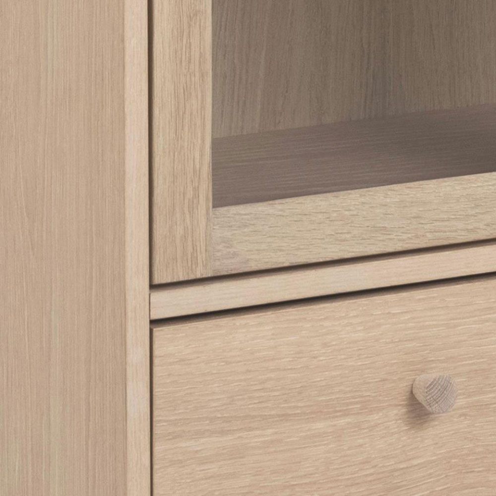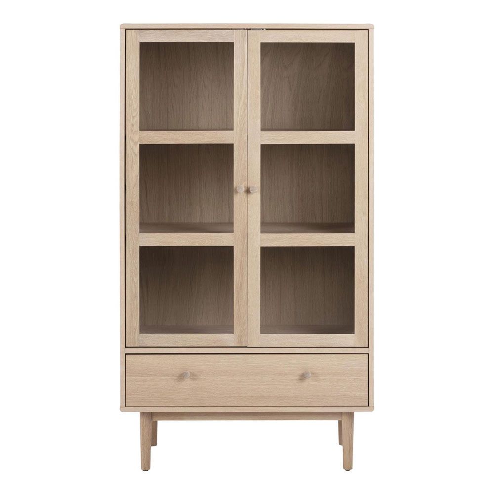 Aston display cabinet, top, frame, drawer and 2 shelves white pigmented oiled oak veneer, 2 doors clear tempered glass and white pigmented oiled oak veneer, base white pigmented oiled oak with metal runners, 80x40x144.8 cmCrafted from solid oak and oak veneer, this display cabinet is a natural choice, if you are a fan of classic Scandinavian design. Behind the glass doors, there are 2 display shelves leaving the drawer free for smaller objects. It is simply a perfect storage solution.