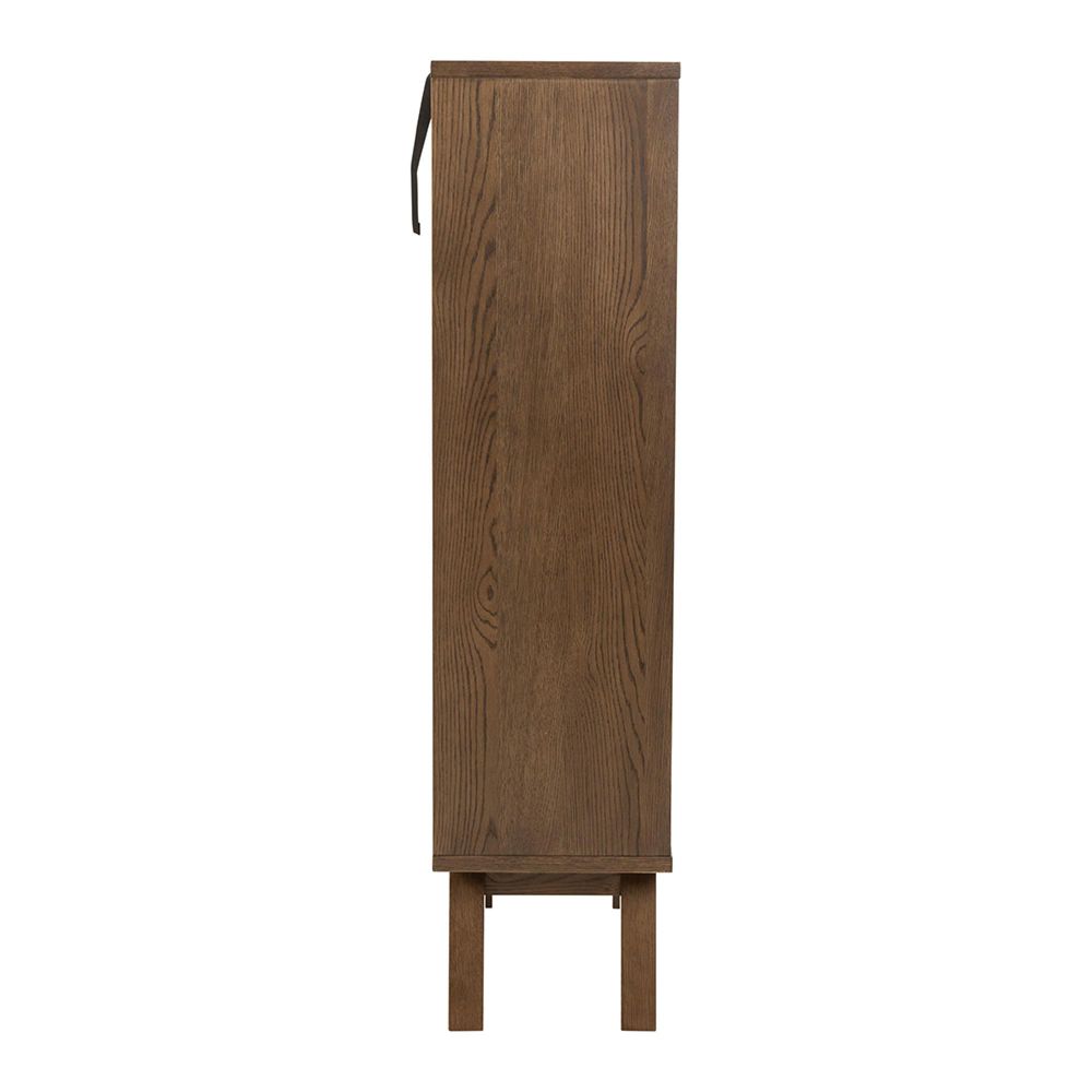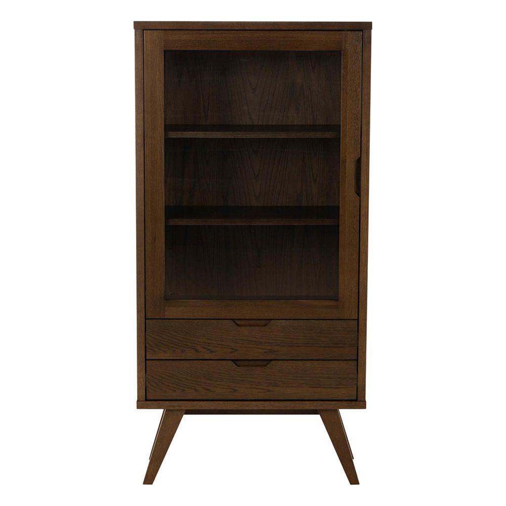 Item Code: 107585 A-Line display cabinet, top, frame, 2 drawers and 2 shelves smoked PU lacquered oak veneer, door clear tempered glass and smoked PU lacquered oak veneer, base smoked NC lacquered oak veneer with metal runners. Meet a display cabinet that provides generous storage space and brings a bit of Scandinavian style too. The cabinet is made of smoked, lacquered oak veneer and is designed with a thick frame and legs creating a flattering sturdy look. With 2 drawers and 2 shelves behind the clear glass door, organising feels easy.Free Delivery