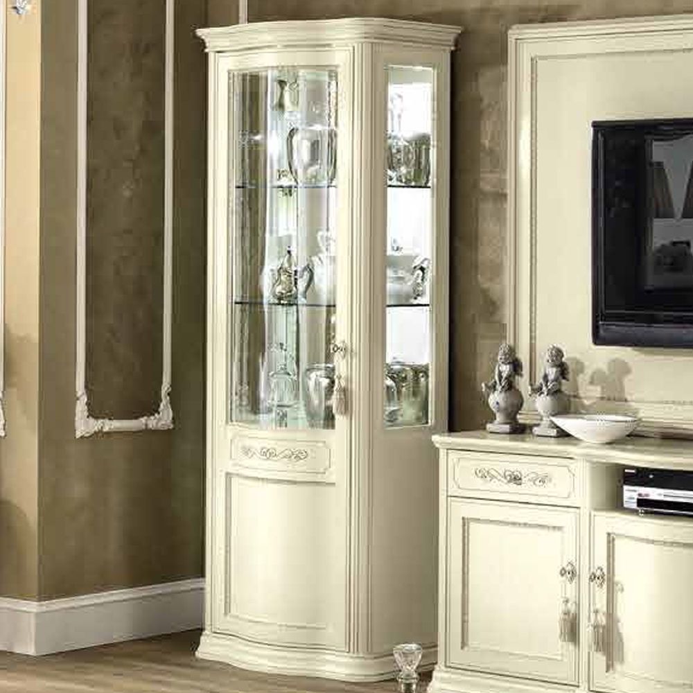 One door vitrines with curved door and molded cornice.Door frames are in solid wood with decorative carvings.Panels are in Ivory or linden wood veneers. Lateral small glass doors open from the sides and are tightly kept closed by a hidden magnet
