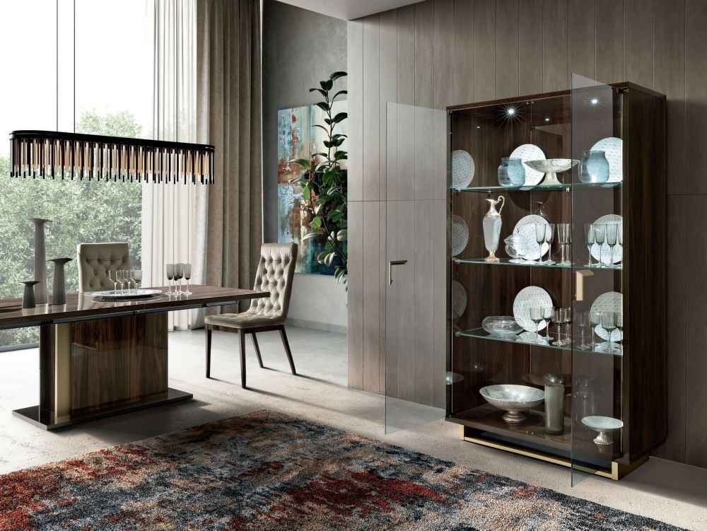 Item Code: 159VT2.01NP Two-door vitrine with tempered fume glass; two led lights and glass shelves included.Warm shades of Patrizio walnut finish with streaked wood pattern give elegance and modernity to Volare collection. Original triangle cut handles in bleached, satin and brushed gold finish with matching plinths.This is a Made to Order itemAll Made to Order items are manufactured as per the order supplied by you.We are unable to accept cancellation or accept any extra cost that may incur due to wrong information provided by you at the time you placed the order.We will confirm all sizes/colours/finishes in written email (order confirmation) with you before going ahead with production of your order.