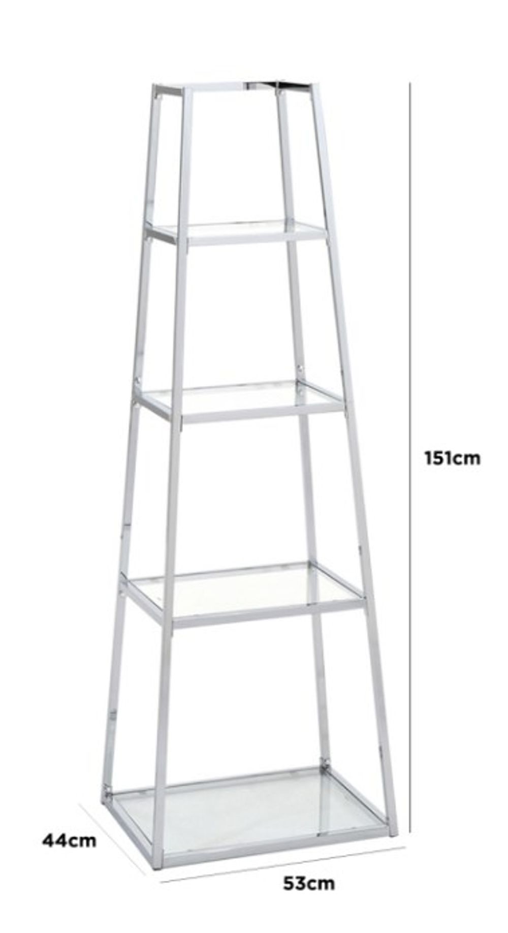 Item Code: MF189-M0-GLS-CL Funk up your displays with this Logan medium chrome ladder display unit. It features a steel frame and 4 clear glass shelves that provide ample storage for your treasured possessions to create a unique focal point in any room.