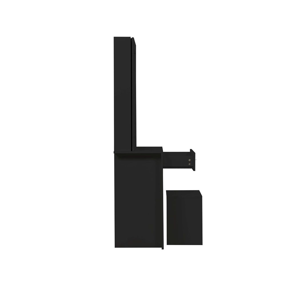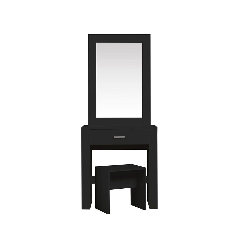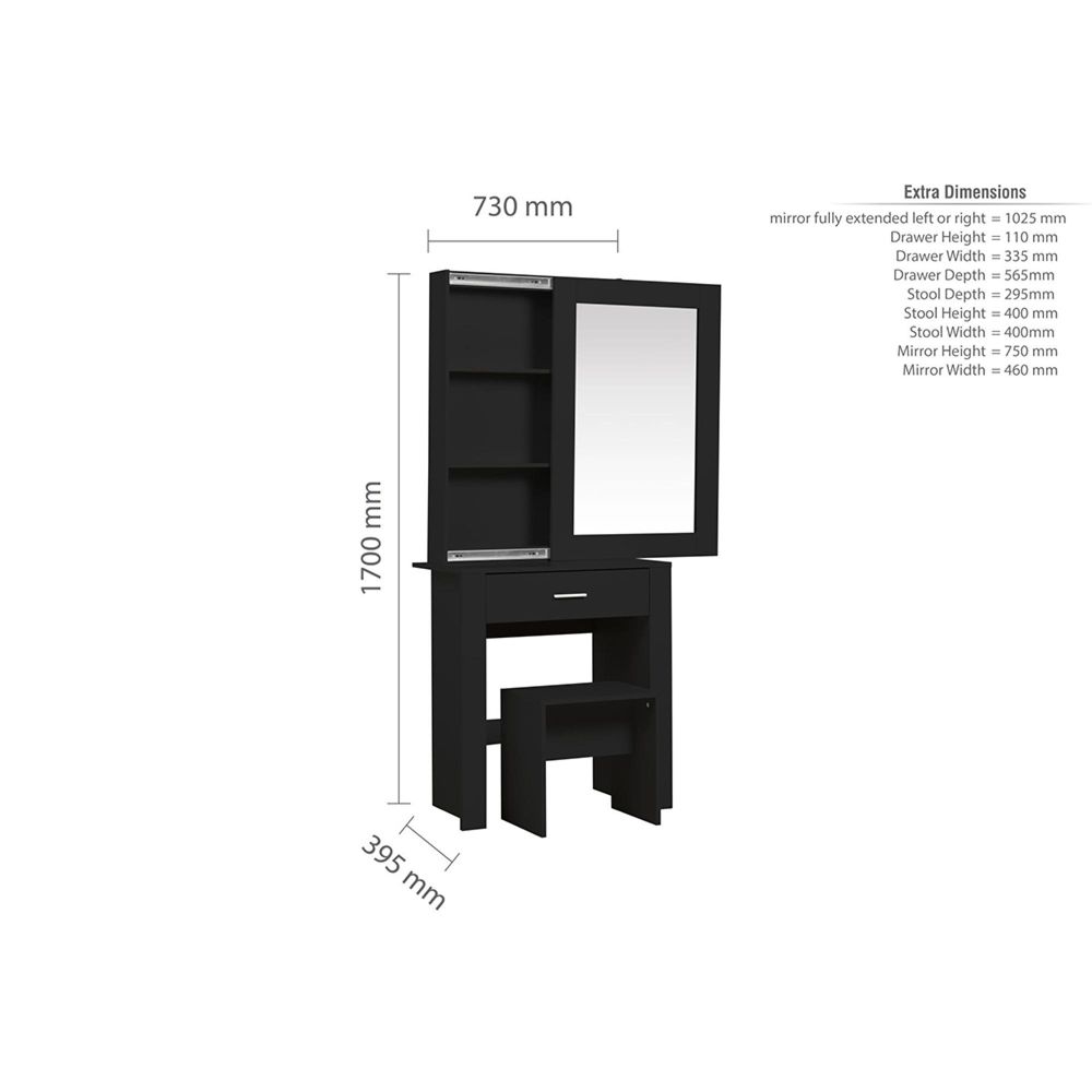 Item Code: EVY1DTSMBLK The Evelyn sliding mirror dressing table is a stylish and practical addition to any bedroom. The Evelyn is a smart, contemporary dressing table for smaller rooms.The dresser has a large sliding mirror that open both left and right incorporating 3 large shelves, well-suited for storing make-up, skincare, jewellery and other household items.The dressing table also comes with a colour matching stool that fits neatly under the dressing table when not in use.