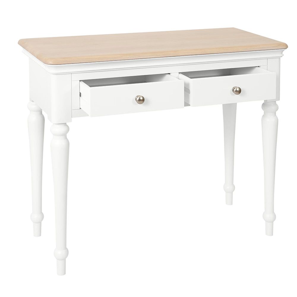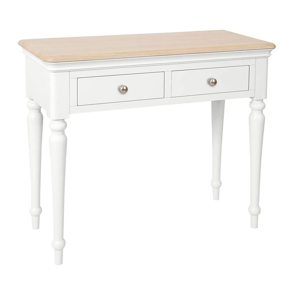 Constructed from a combination of white oak, pine, and MDF, the dressing table showcases durability alongside its graceful appearance. The lightly lacquered solid oak top adds warmth and contrast to the painted body, while the turned legs bring a touch of traditional craftsmanship. Finished with sleek metal knobs, the two drawers provide ample space for storing beauty essentials, jewellery, or accessories, keeping everything within easy reach.