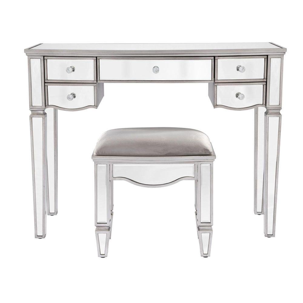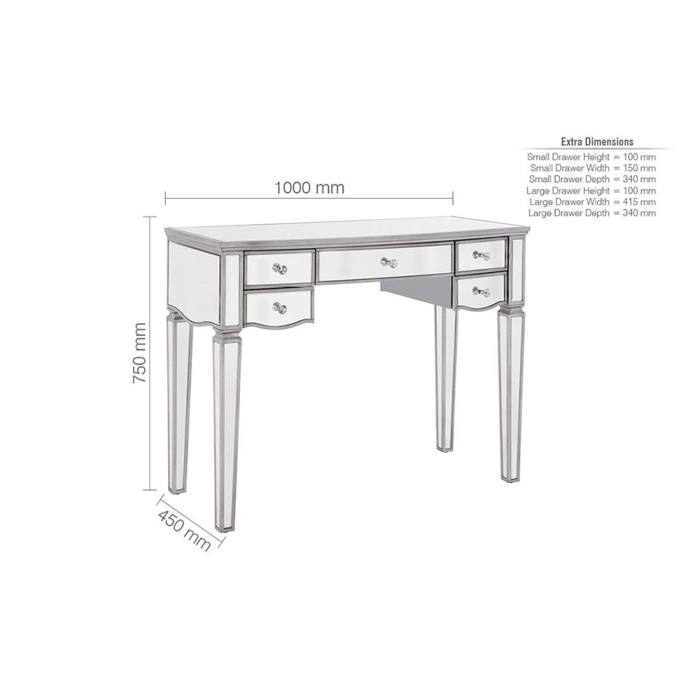 Item Code: ELY5DTMIRV2 Give your bedroom a sophisticated finish with the Elysee 5 drawer dressing table.Elegantly made this 5 drawer dressing table is crafted in a clean, detailed design with a beautiful glass mirrored finish to provide a sense of space and light even in the dullest of roomsComplete with crystal handles, this Elysee dressing table features one large drawer, as well as four smaller drawers ideal for storing an array of products. All drawers feature a luxurious velour lining.This versatile range will sit comfortably in a modern or traditional setting making this mirrored furniture a welcome addition to any home.Cleaning and Care: Wipe with dry cloth.