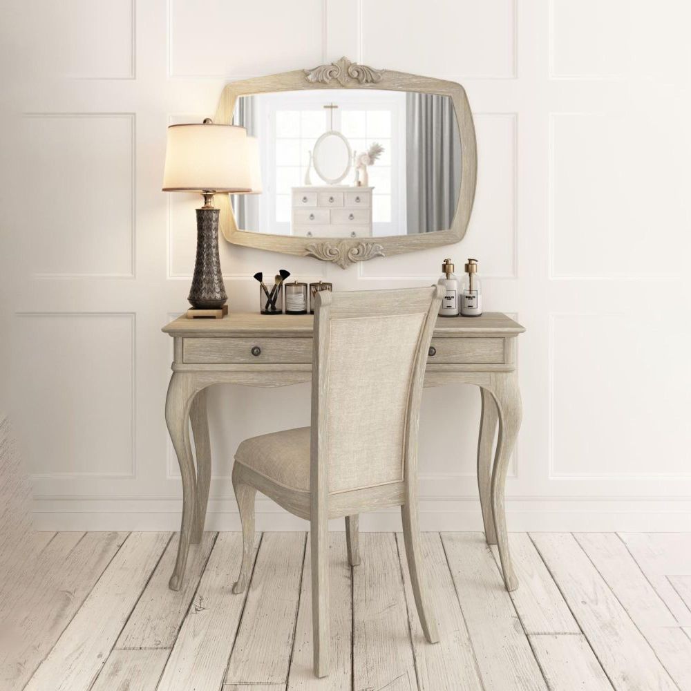 Designed for everyday use, the table features two smooth-gliding drawers with antique pewter knobs, providing convenient storage for cosmetics, jewellery, and personal essentials. The hand-carved detailing and cabriole legs showcase the craftsmanship and attention to detail that define the Camille Collection. Its elegant silhouette and neutral tone make it versatile enough to complement both traditional and contemporary bedroom interiors.