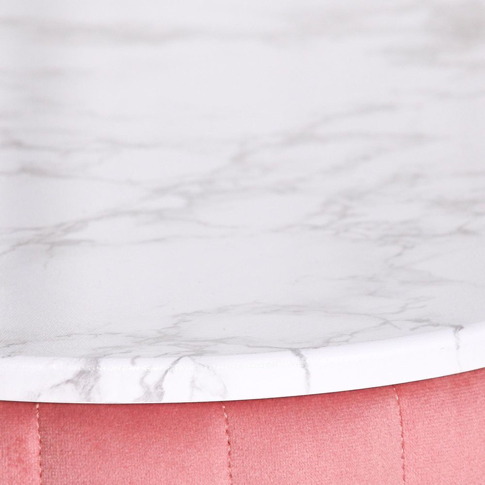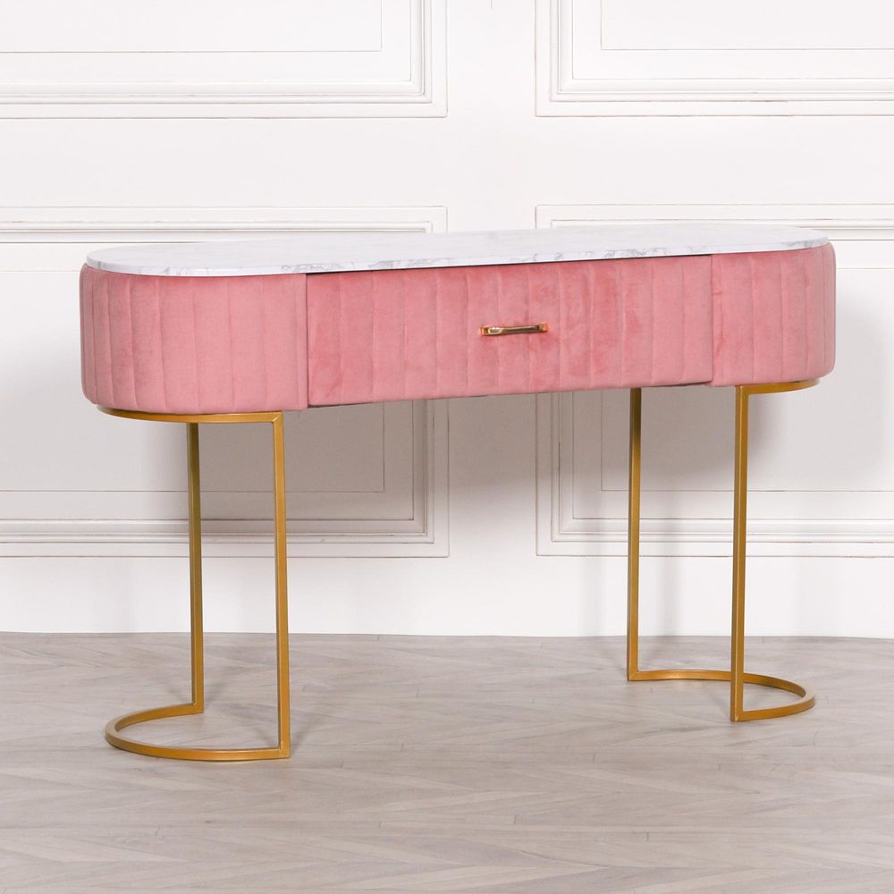 Item Code: AV672 This luxurious dressing table is upholstered in pink velvet and features a stunning marble effect top. Crafted from hardwood, MDF, metal and fabric, it also features a matching pedestal for complete convenience. Finished in a beautiful pink hue, this is an ideal addition to any home.