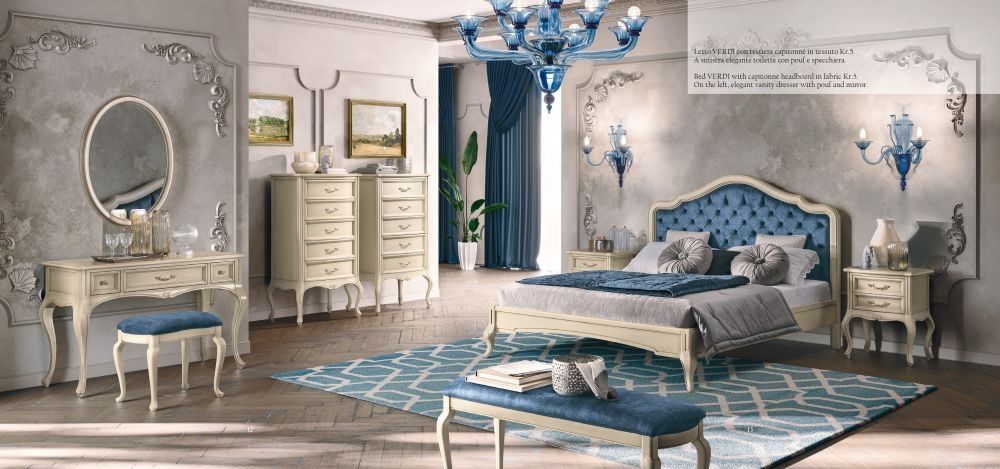 Item Code: 169SCR.01AV Footstool Not Included in Set.True solid wood carved and varnished according to the Italian tradition of the furniture artisan masters.Varnishing performed by a skilful and sensitive hand achieves chromatic solutions and complex antique shades which enhance the warmth and charm of a glamourous mansion. The typical gouge and the traditional woodwork chisel by which the Venetian artisan creates delicate and enchanting wood engravings. Bed VERDI with capitonne headboard in fabric Kr.5. On the left, elegant vanity dresser with pouf and mirror. The headoard in solid wood is cut, bent hand carved and hand varnished, patinated, brushed and antique made. Both sides and bottom drawers are in birch wood to guarantee solidity and weight resistance.This is a Made to Order itemAll Made to Order items are manufactured as per the order supplied by you.We are unable to accept cancellation or accept any extra cost that may incur due to wrong information provided by you at the time you placed the order.We will confirm all sizes/colours/finishes in written email (order confirmation) with you before going ahead with production of your order.