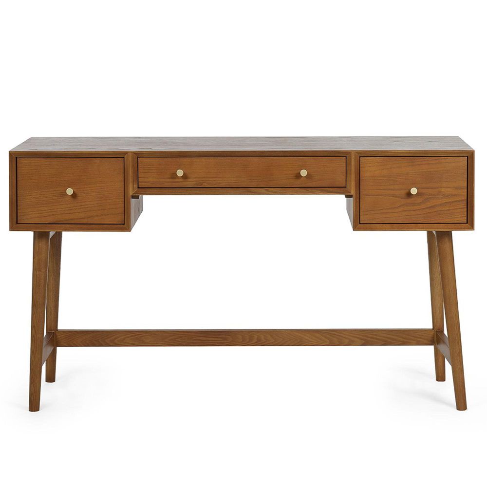 Item Code: LOW054 A retro inspired style with a nostalgic feel, the Lowry Dressing Table and Stool Set adds the perfect timeless look to any bedroom space. Constructed from an exquisite cherry ash wood veneer with beautifully tapered legs. Featuring 2 wide drawers, one narrow drawer, and an upholstered padded stool. Complemented by golden frame knobs.