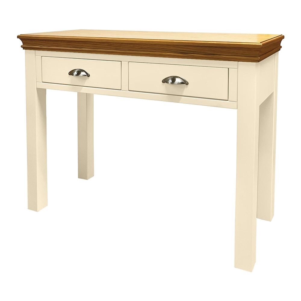Refined and practical, the Versailles Ivory Painted 2 Drawer Dressing Table is a stylish addition to any bedroom. Finished in a graceful ivory painted body with a contrasting natural oak top, it captures timeless elegance while offering everyday functionality.