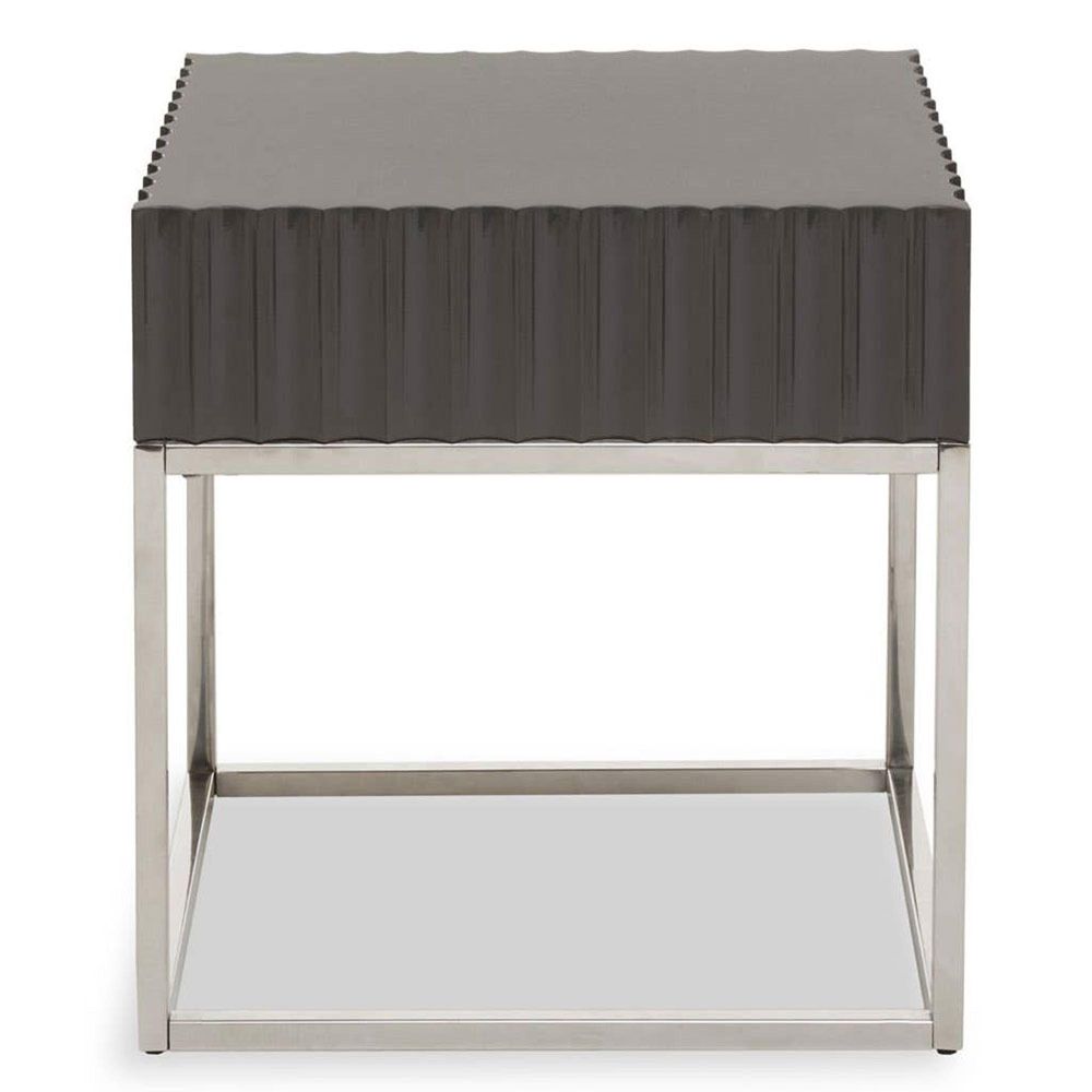 Sleek and stylish, the Genoa square end table with a grey finish will complement modern living or bedroom decor.This is a modern and stylish side table with a sleek design. The square tabletop features a round, high gloss grey finish with a beautiful fluted texture. It is supported by a minimalist and sturdy stainless steel base, creating a contemporary and elegant accent piece.