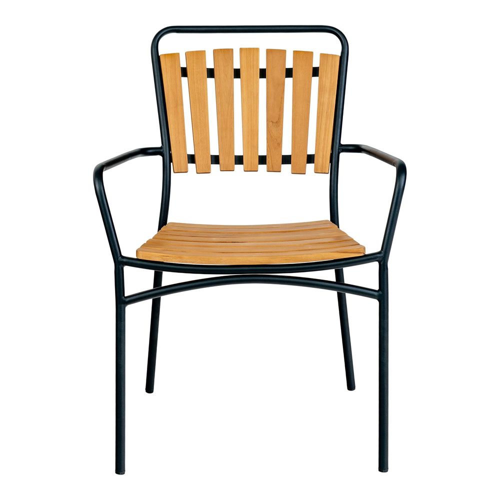 The Set of 4 Cleveland Natural Teak Wood Garden Dining Chairs brings timeless character and craftsmanship to any outdoor dining space. Made from natural finish teak wood, each chair features a Scandinavian-inspired classic design that is both visually appealing and reassuringly sturdy. The slatted backrest and seat provide comfort and airflow, while the black metal frame adds a striking contrast that complements any garden, patio, or outdoor dining setting.