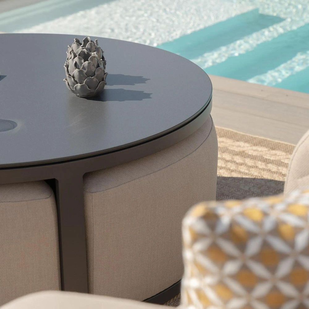 The Maze Round Coffee Table With x3 Footstools in Oatmeal is a perfect standalone addition to any existing set in the same colourway. The coffee table is topped with tempered glass which is finished with a robust ceramic mottled black colourway and features three footstools in matching fabric that can nest within the framework. The two tones of the ceramic finish ties together the dark grey framework and natural colourway of the sofa set. The Outdoor fabric range boasts the intelligent technology of quick-drying foam and solution-dyed acrylic cushion covers which are treated to minimise water permeation.