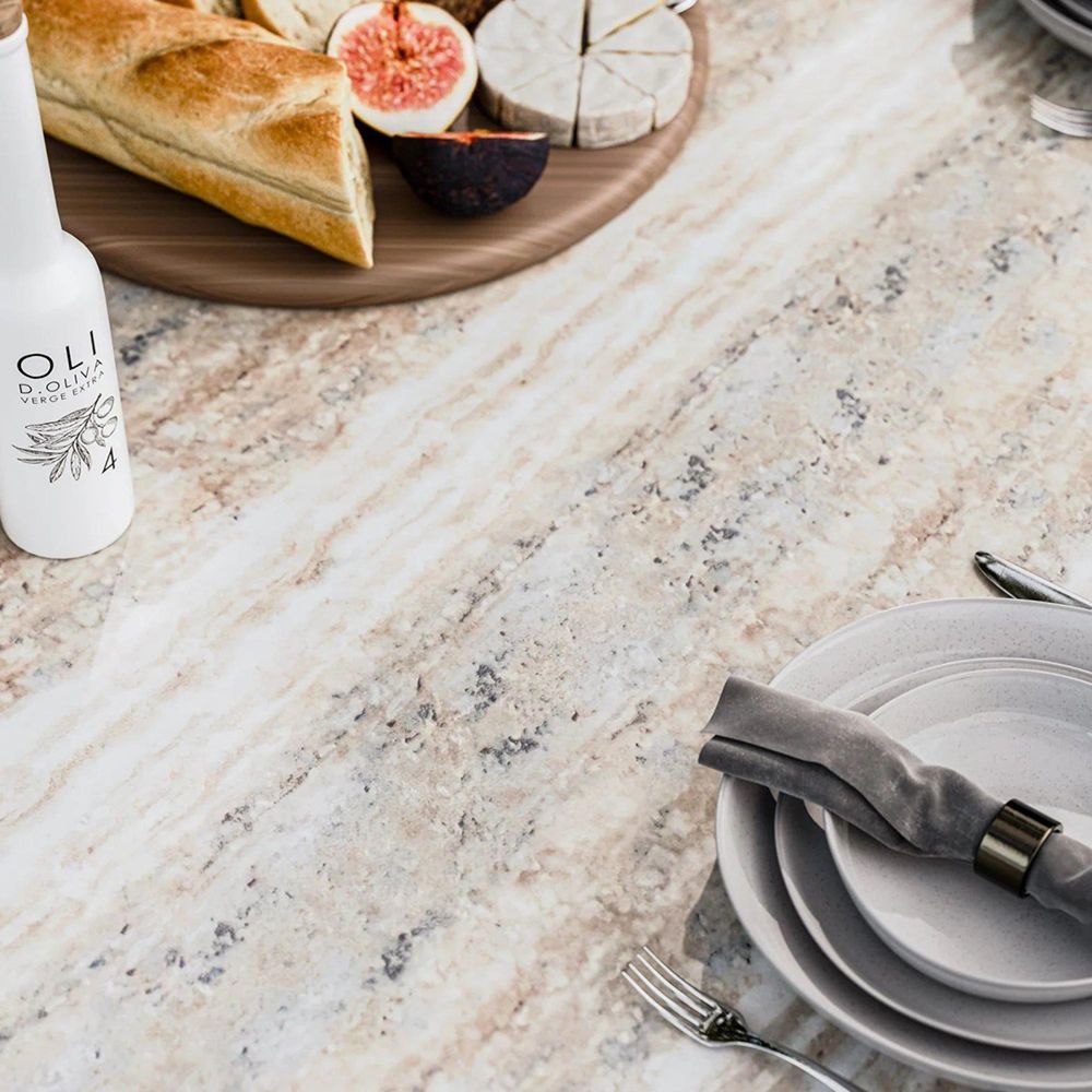 - Travertine effect concrete top dining table, with a smooth natural finish and conical wood slat base.
