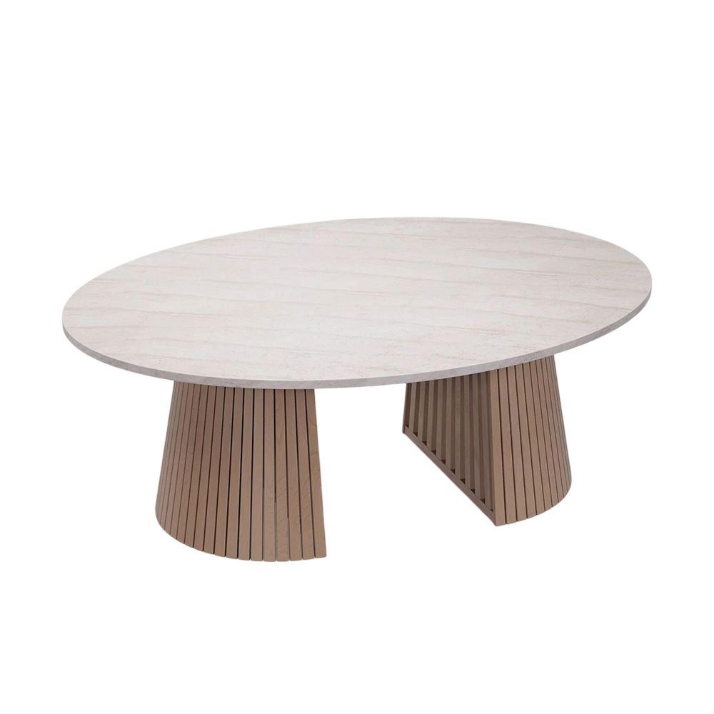 - Travertine effect concrete top dining table, with a textured natural finish and conical wood slat base.