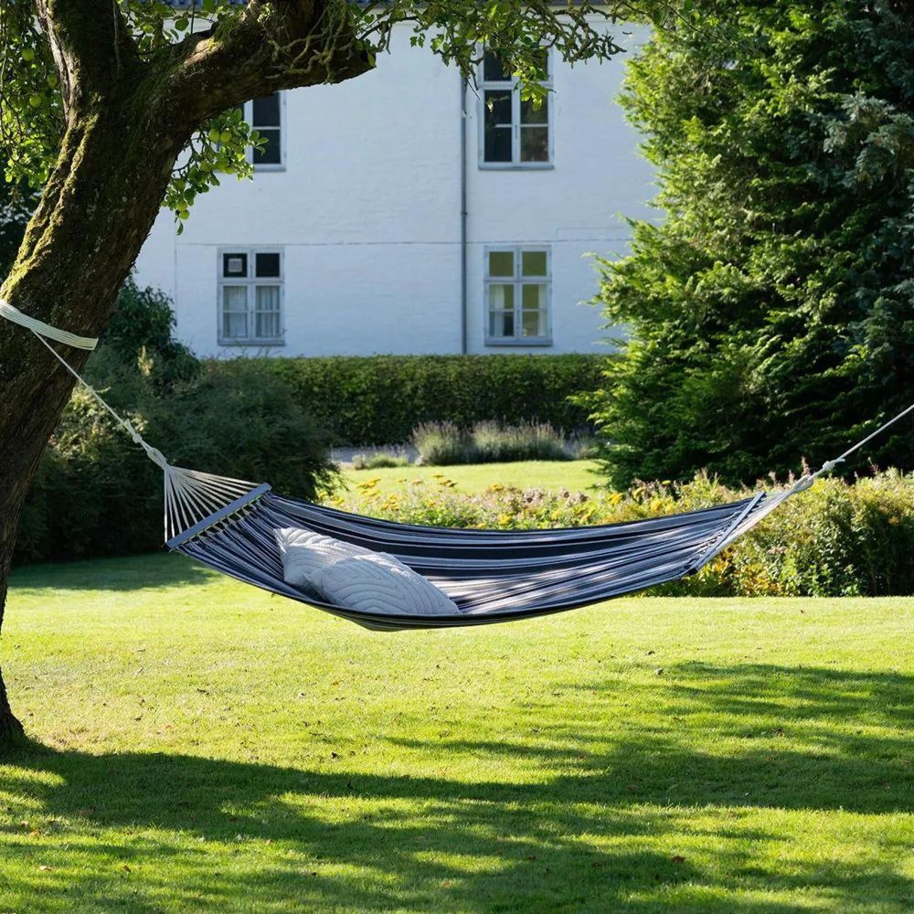 Made for patios, terraces, balconies, and shaded garden corners, this hammock chair is built to withstand daily outdoor use. The strong fabric structure provides a stable feel, while the weather-resistant properties ensure long-lasting performance throughout the year. With generous width and supportive seating, it creates a relaxing spot for reading, resting, or quiet weekend lounging.