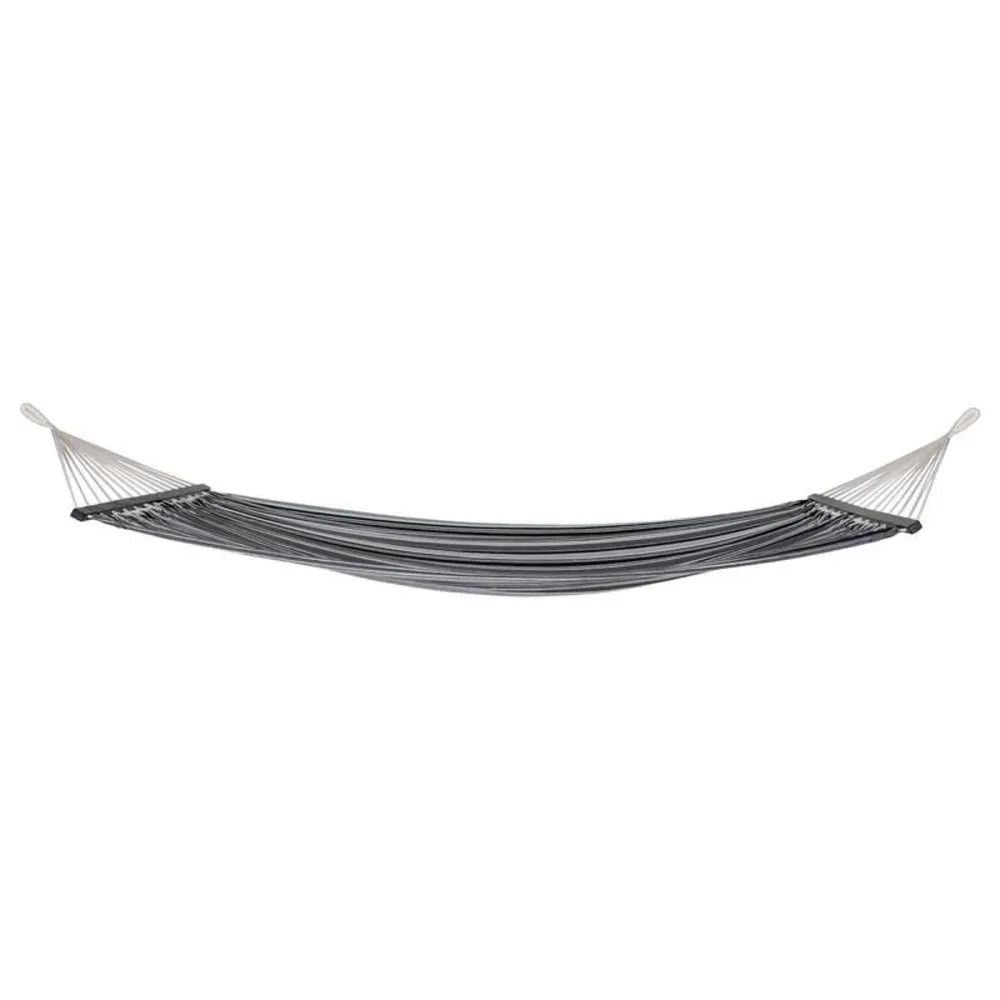 The Lamia Grey Fabric Large Hammock Chair brings a calm, modern touch to outdoor leisure spaces. Designed with a striped blend of grey, black, and white tones, it offers a minimalist look that pairs well with a wide range of garden styles. Crafted from a durable cotton and polyester mix, it rests across smooth wooden spreader bars that support the fabric while keeping the seat open and comfortable.