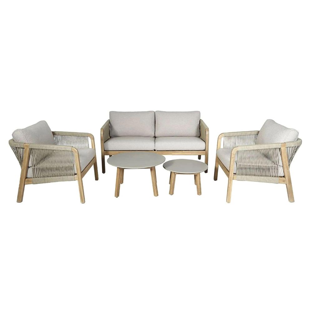 Item Code: MART2-2SLS-LB The Maze Martinique 2 Seat Lounge Set features sturdy wooden framework composed of sustainably sourced Acacia wood finished with a vintage light teak look. The framework comes with adjustable feet to ensure it sits perfectly level on any surface and is wrapped with an intricately intertwined taupe round polypropylene rope, this beautifully designed structure can be left outside all year round. Whilst we would recommend storing the cushions away in the wetter months, they feature a high-performance olefin material which is both water and stain-resistant. The comfortable and detailed two seat sofa and armchairs and paired with nesting coffee tables that include a wooden base and are complete with striking concrete-composite table-top. The charming design of the Martinique range lends itself to both indoor and outdoor settings, the elegant characteristics echo a style that would suit an outdoor setting as equally as it would enhance your orangery, conservatory, or any internal space. Please note: Acacia wood will weather to a soft grey over time. Small cracks and fissures may develop with changes in humidity and temperature. This is a natural characteristic of solid wood furniture. Character and grain of the wood will vary for each piece.