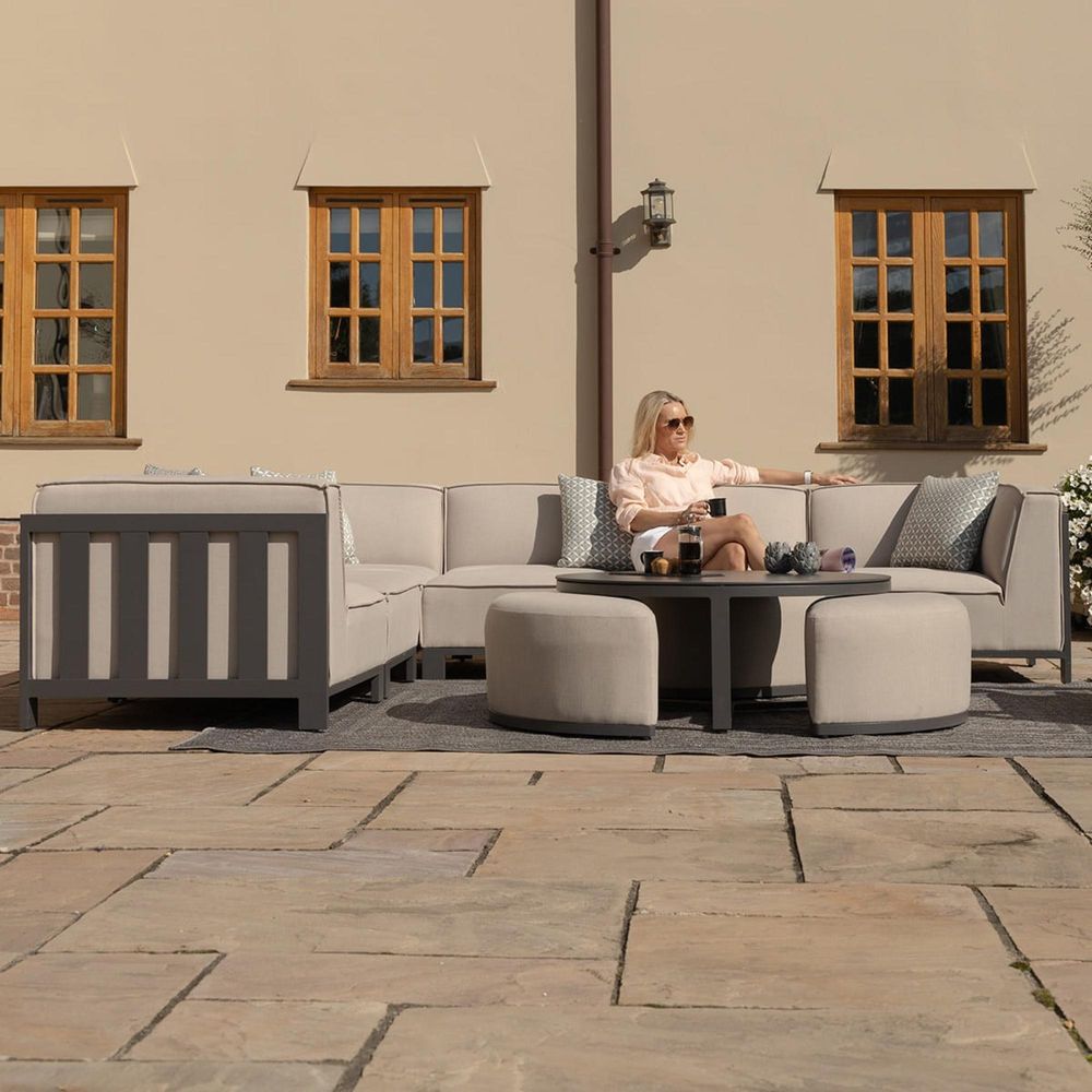 The Maze Ibiza Medium Corner Sofa Set is a luxurious and versatile modular outdoor seating solution, finished in a sleek two-tone zinc grey outdoor fabric for a contemporary look. Its modular design allows for customisable seating arrangements, making it ideal for both intimate gatherings and larger outdoor spaces.This set includes a stylish round coffee table with a durable, modern design, perfect for outdoor entertaining. Nestled beneath the table are three cleverly designed triangular footstools, wrapped in the same high-quality fabric as the sofa. These footstools not only provide additional seating but can also be used as convenient footrests or tucked away when not in use. With weather-resistant materials and deep, plush cushions, this set offers both comfort and sophistication, making it an excellent addition to any patio or garden.SpecificationLa Vita High Performance FabricFabric made of Solution Dyed AcrylicCushion Filling - Quick Dry FoamFrame - Powder Coated AluminiumTable Glass - Ceramic Tempered GlassLeave outside all year roundSet Includes3x Corners3x CentersRound Coffee Table with x3 FootstoolsIncludes FREE Winter Covers (Individual)Winter Cover Corner Piece - W89 x D89 x H68cmWinter Cover Middle Piece - W73 x D89 x H68cm