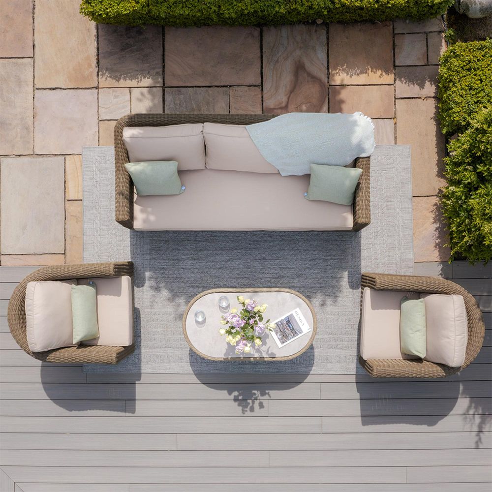 Enhance your outdoor area with the Maze Winchester 3 Seat Rattan Sofa Set, which combines refined comfort with timeless style. This spacious set is ideal for larger gatherings or casual lounging, featuring a luxurious three-seat sofa, two matching armchairs, and a generously sized oval coffee table, perfect for leisurely afternoons or evening entertainment. The set showcases Maze's signature thick-shaped arms, providing exceptional comfort and support. Crafted with a classic rounded and half-rounded polyethylene (PE) rattan weave, the natural tones are beautifully complemented by soft beige cushions, creating a warm and elegant aesthetic suitable for any patio, garden, or terrace. The coffee table, featuring a ceramic surface, serves as a stylish, glass-free centerpiece that is both durable and easy to maintain. The cushions are constructed from 100% polyester with high-quality polyurethane foam filling, ensuring lasting comfort and resilience. Although they are shower-resistant for light weather exposure, we recommend storing them indoors overnight to maintain their best condition. Expertly hand-woven onto a powder-coated aluminum frame, the Outdoor Sofa Set is designed for durability and long-lasting use throughout the seasons. With its ideal blend of practicality, luxury, and timeless design, the 3 Seat Sofa Set elevates any outdoor space into a sophisticated retreat.