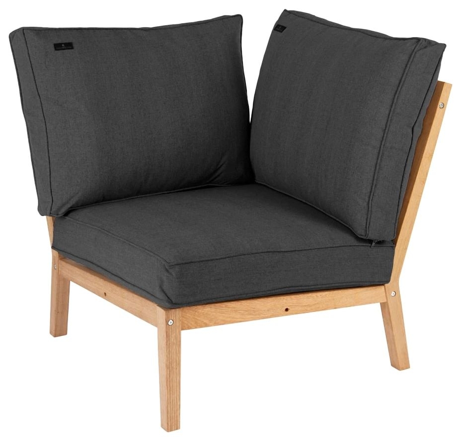 Item Code: 161 Please Note: All images used are for illustrative purposes only. For actual product please refer the cutout images available at the end of each product.This corner chair can be connected with a modular middle chair from the same range, to create a beautiful and extremely versatile garden sofa set.The frame is pared back, elegant and contemporary – inspired by beautiful Scandinavian design. The strong Roble hardwood is smooth-to touch with a visible natural grain.The charcoal cushions are plump, inviting and we can guarantee you wont want to get up and do anything once youve sunk into them.