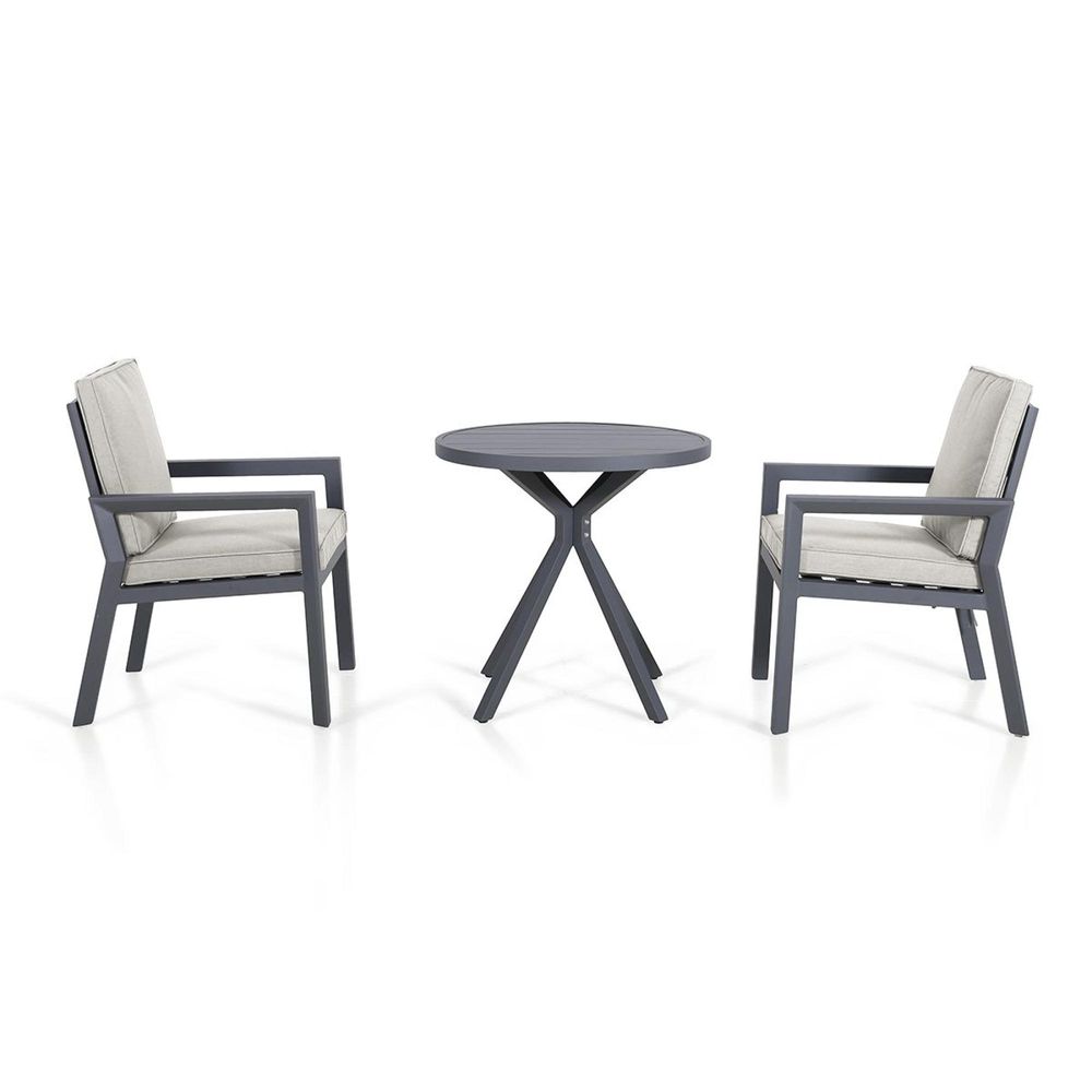 Item Code: ALU-NY-101040-DG Our Maze New York 3 Piece Bistro Set is a little balcony bistro designed to bring a simple relaxation area to your small garden space. Early morning coffee or late evening wine, a simplistic chair and table to unwind. The dark grey framework is beautifully complented by a new pale grey colourway cushion for 2024.Set Includes: