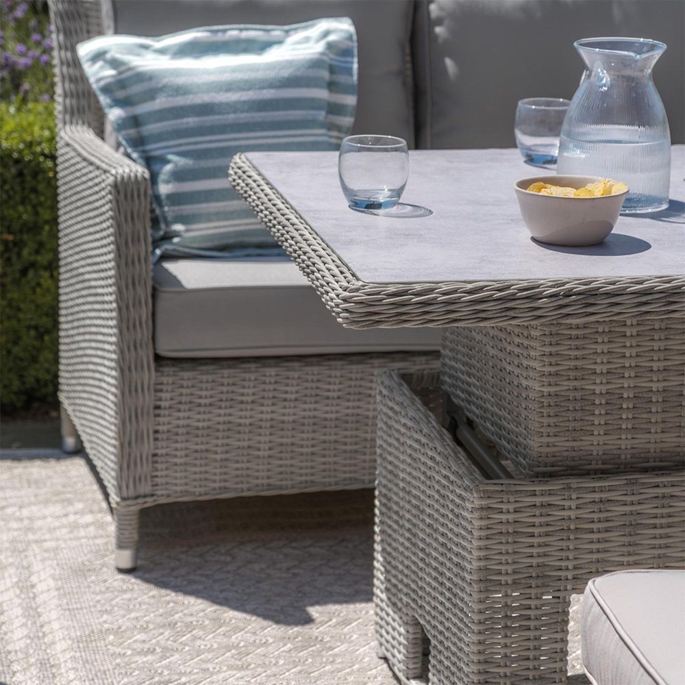 Enhance your outdoor area with the Maze Oxford Sofa Dining Set featuring a Rising Table, which combines style and versatility. Ideal for those who appreciate both relaxation and dining outside, this multifunctional set merges comfort, luxury, and practicality, making it suitable for gardens, patios, or outdoor living spaces. The set includes a three-seat sofa along with two coordinating rattan armchairs, all crafted with deep, low-slung seating and generously padded grey cushions to ensure a comfortable lounging experience. Additionally, two cushioned stools offer extra seating or a convenient spot to rest your feet. At the heart of the set is a rectangular rising table topped with light grey ceramic tempered glass, enabling you to effortlessly transition between dining and coffee table heights. Hand-woven from the Oxford range's grey half-round rattan and constructed on a powder-coated aluminium frame, this set is built to last, resistant to all weather conditions, and requires minimal maintenance. The cushions are shower-resistant and filled with supportive foam; for optimal longevity, it is recommended to store them indoors when not in use. Whether you are hosting a dinner party or simply enjoying a casual drink in the sun, the Oxford Sofa Dining Set with Rising Table seamlessly adapts to any occasion, providing stylish and premium outdoor living.