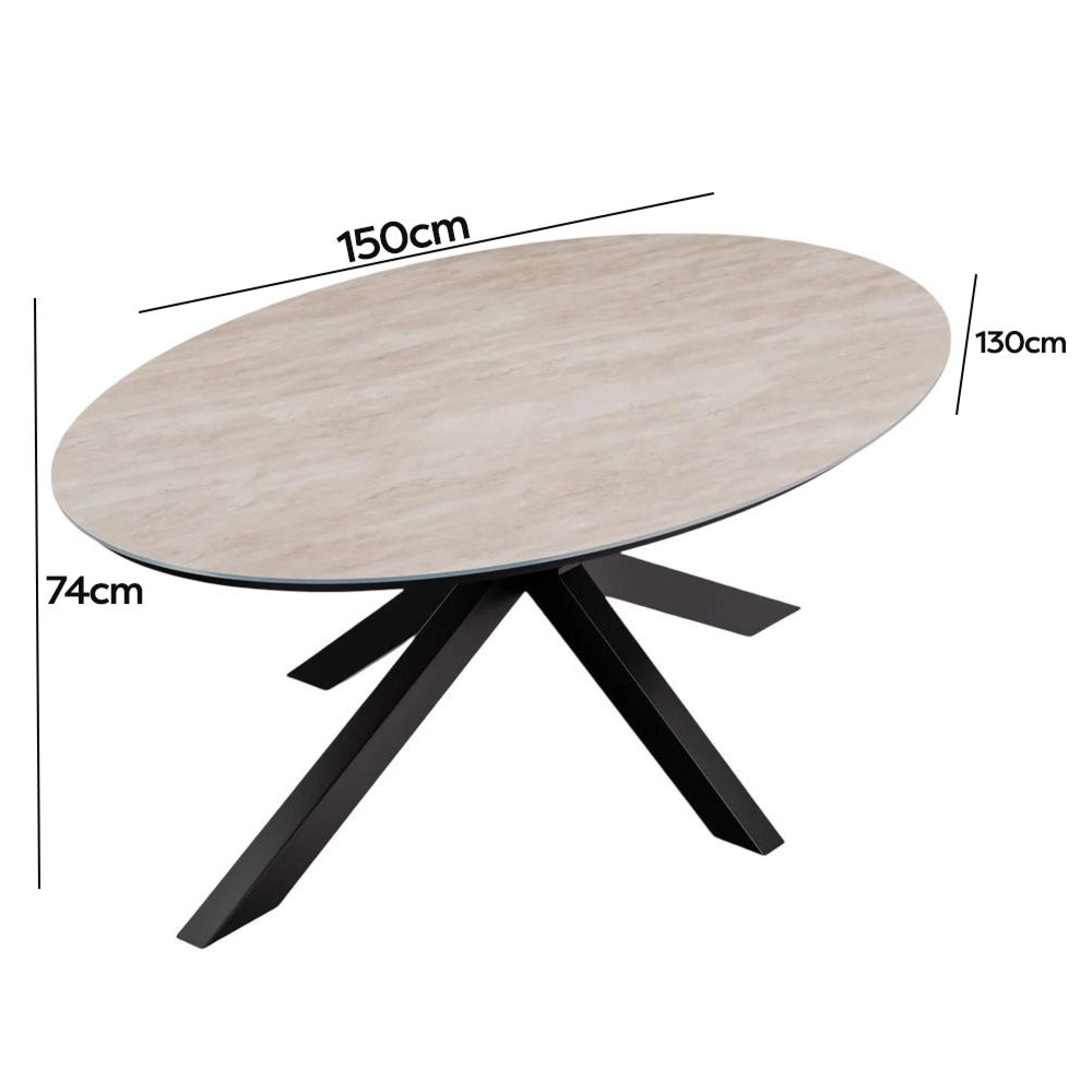 - Bali 200cm x 130cm ellipse natural tone ceramic glass top dining table with black x-leg aluminium frame.