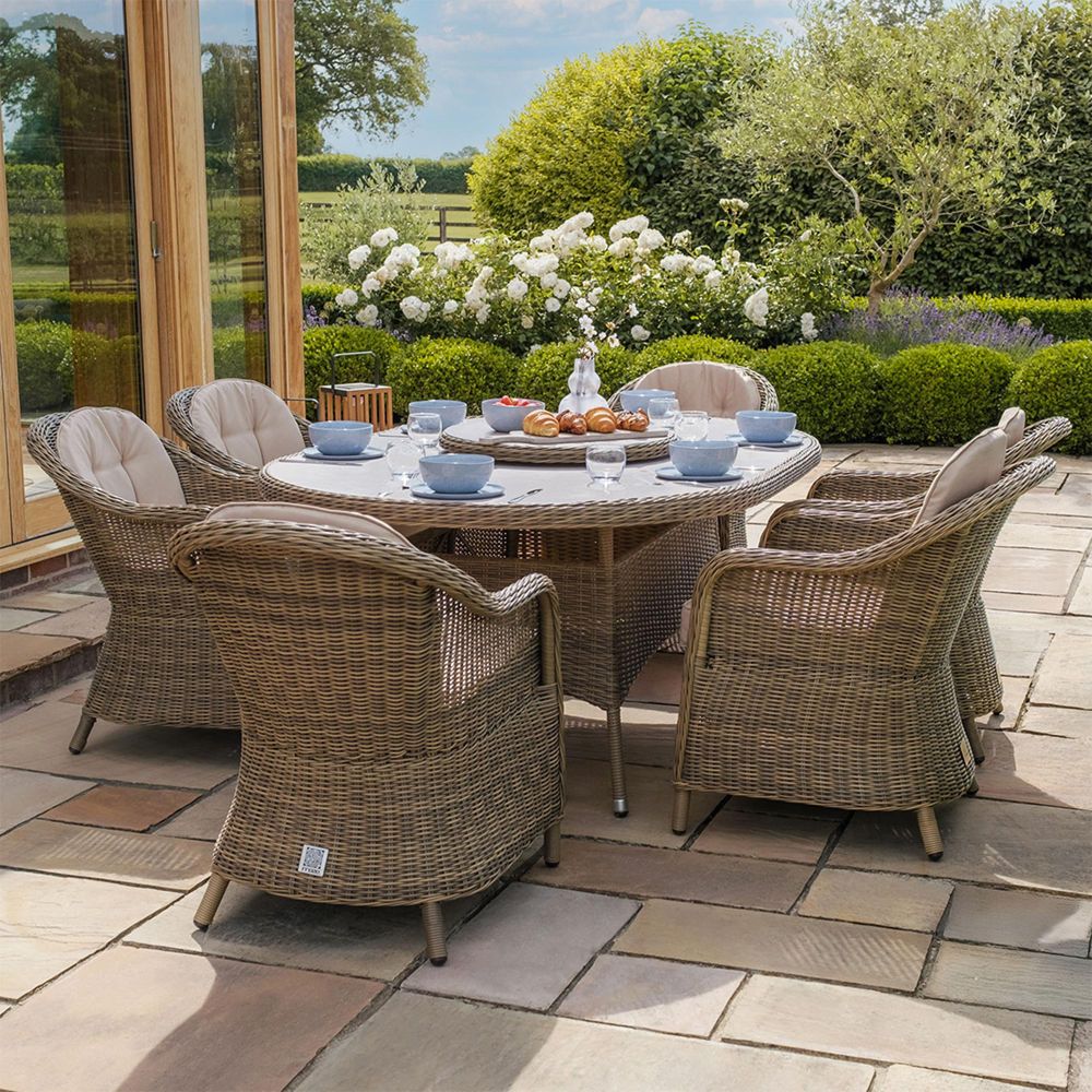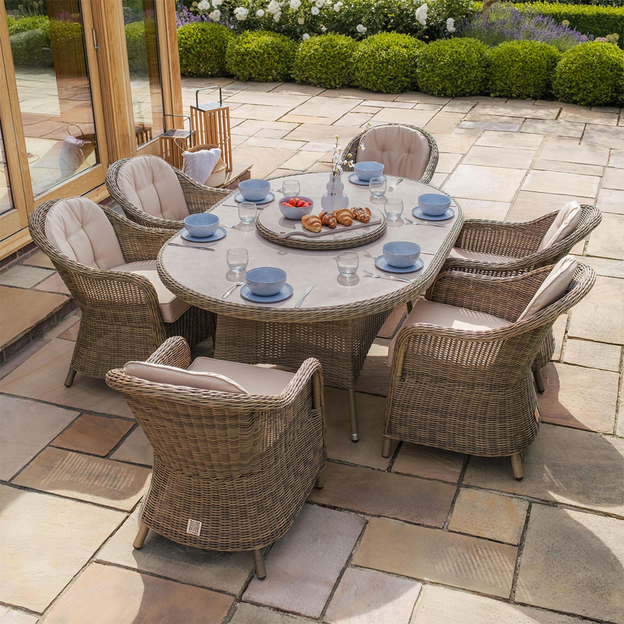 Enhance your outdoor area with the Maze Winchester 6 Seat Oval Rattan Dining Set featuring Heritage Chairs and a Ceramic Glass top. This dining set is meticulously hand-crafted from high-quality polyethylene (PE) rattan, showcasing a classic rounded and half-rounded weave that harmonizes beautifully with both traditional and modern garden aesthetics. The spacious oval dining table is equipped with a ceramic surface, providing a sleek and elegant finish that is easy to care for and complements the natural hues of the rattan. The table features an integrated parasol hole for optional shade and includes a matching woven lazy Susan, ideal for sharing food and beverages with your guests effortlessly. The six high-back Heritage chairs are designed for both aesthetics and comfort, adorned with plush, shower-resistant cushions made from 100% polyester and filled with resilient polyurethane foam. Each chair offers excellent support and comfort, making it perfect for extended outdoor dining experiences. Built on a powder-coated aluminum frame, this set ensures remarkable durability and resistance to the elements, serving as a reliable centerpiece for your patio or garden. Whether you are savoring a peaceful breakfast or hosting friends under the stars, the 6 Seat Oval Dining Set provides an exquisite blend of luxury, functionality, and enduring outdoor elegance.