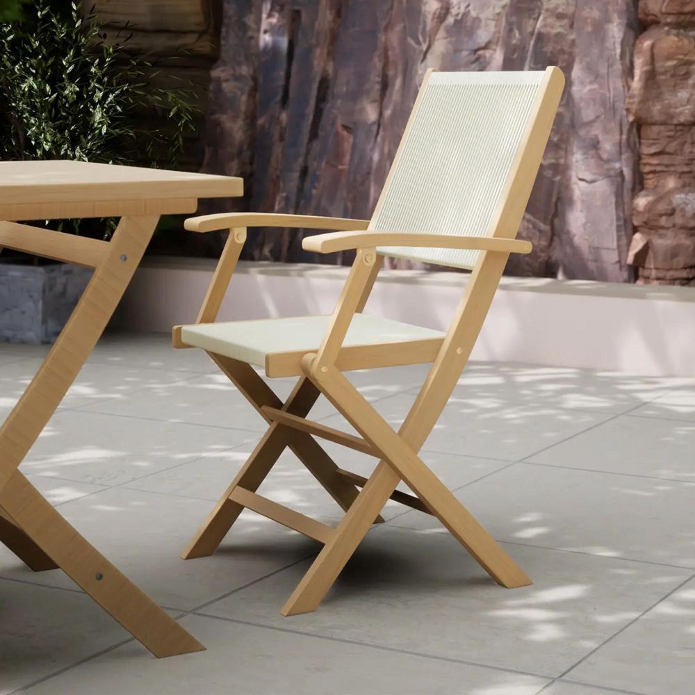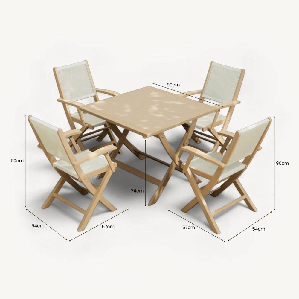 The 90cm square folding table provides generous space for dining and socialising, making it perfect for family meals, relaxed lunches, or evening drinks outdoors. With a central parasol hole and cap, the table gives you the option to add shade during sunny days, while maintaining a clean and polished look when the parasol is not in place. Four matching London folding armchairs complete the set, offering comfort, convenience, and timeless design.