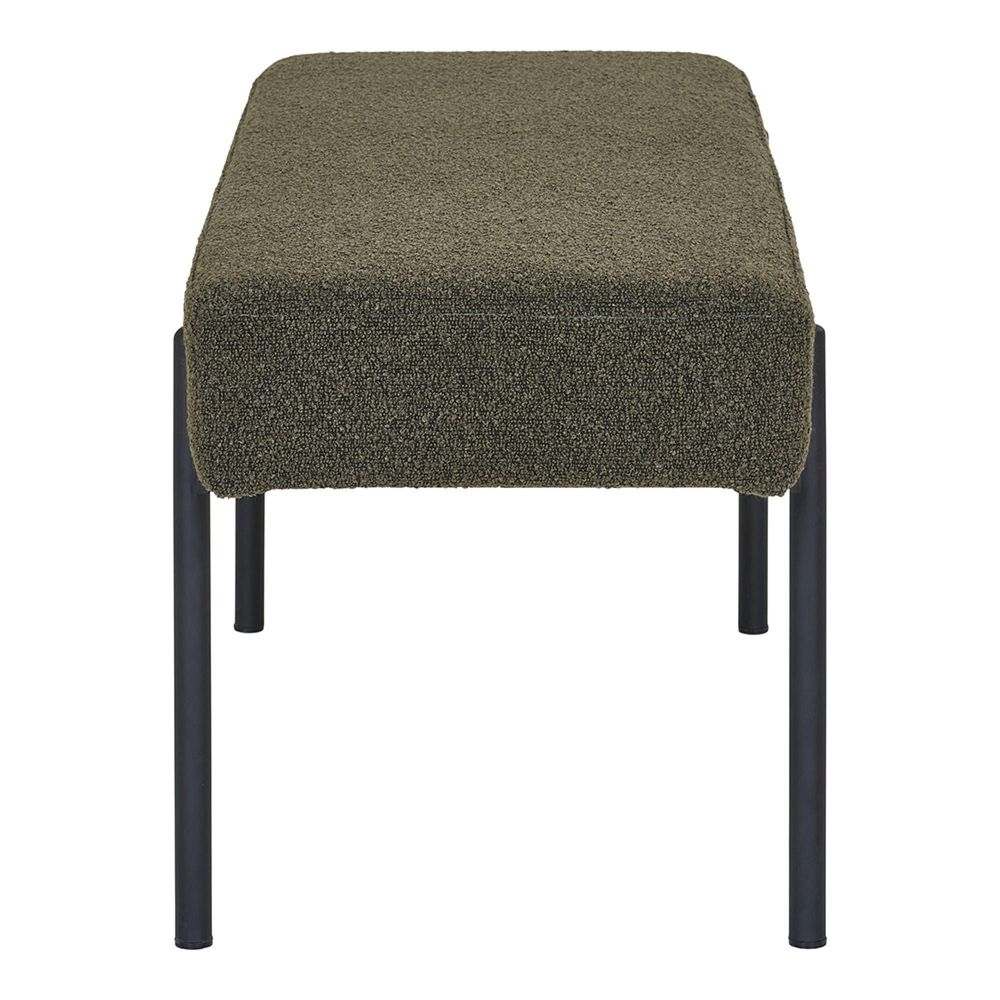 Bring modern comfort and Scandinavian style into your home with the Swindon Dark Green Boucle Fabric Bench. Designed with a clean, rectangular silhouette and finished in a rich dark green bouclé fabric, this piece offers a balance of cosy texture and timeless character. The plush upholstery gives the bench a soft, inviting feel, while the structured form and black steel legs add a refined, contemporary look suited to upscale interiors.