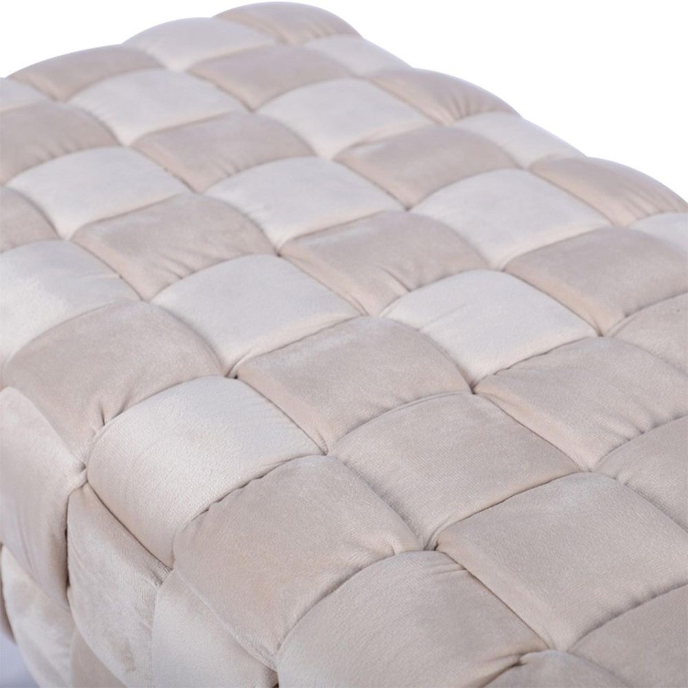 Item Code: FN168-00-CRGD A Dark Cream Velvet Woven Bench with Gold Legs is an elegant and luxurious furniture piece. Upholstered in a plush dark cream velvet fabric with a woven design, it boasts sophisticated gold legs that add to its opulent charm. This bench offers a refined and lavish aesthetic, providing both comfort and a touch of glamour to any space.Free Delivery