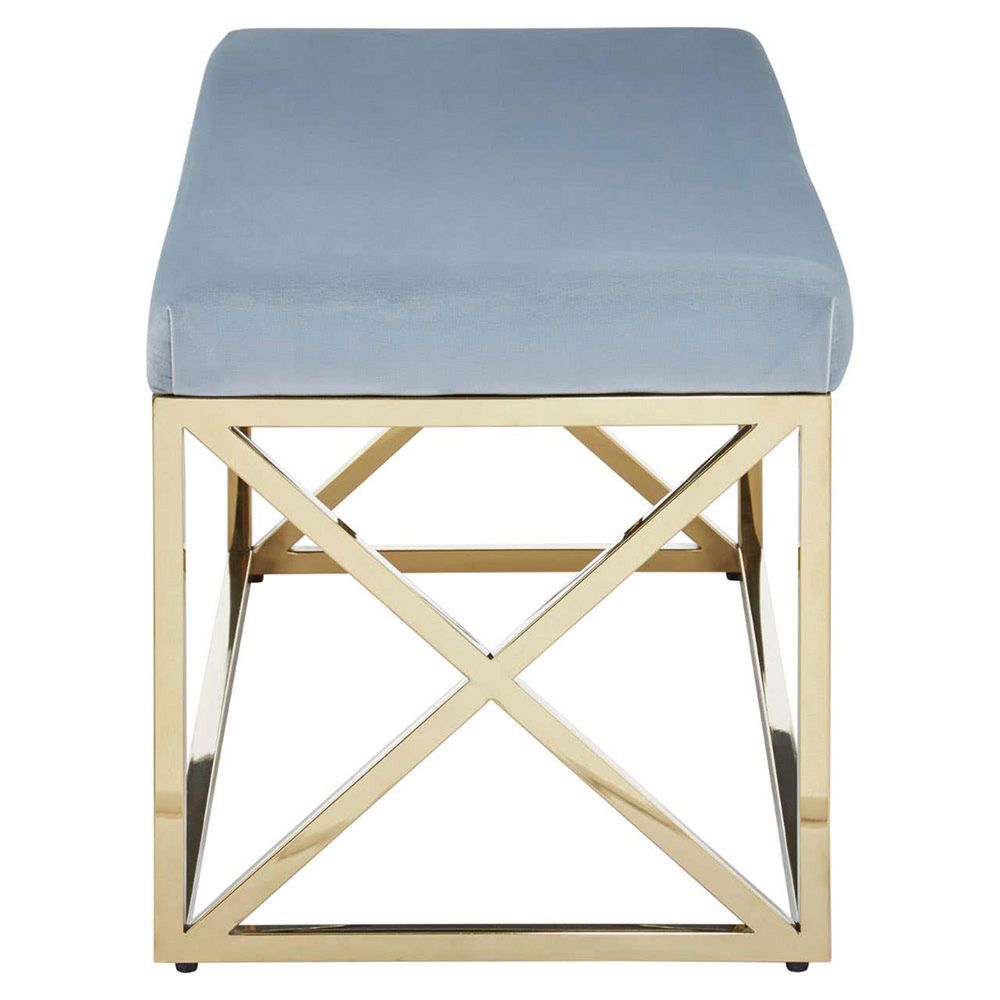 Item Code: 5502603 The Allure Hall Bench is a luxe accent piece designed to complement contemporary interior settings.This stylish Hall Bench features a frame made from smooth stainless steel. It sports a rich reflective gold finish and has minimal lines which are interrupted by the cross sections at each side. The plump seat is upholstered with plush powder blue Velvet Fabric. It looks great styled with luxe design furniture and lighting.
