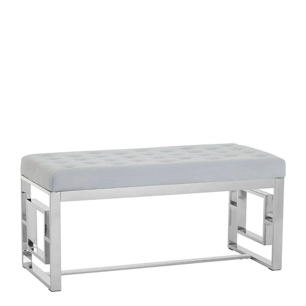 Item Code: 5502604 The button tufted finish of this Hall Bench adds a textured look and feel to this stylish accent piece.Its cushioned seat is upholstered with soft powder blue Velvet Fabric. The base is made from stainless steel with a reflective finish that contrasts with the muted powder blue upholstery. Both sides feature a suspended square for added visual depth.