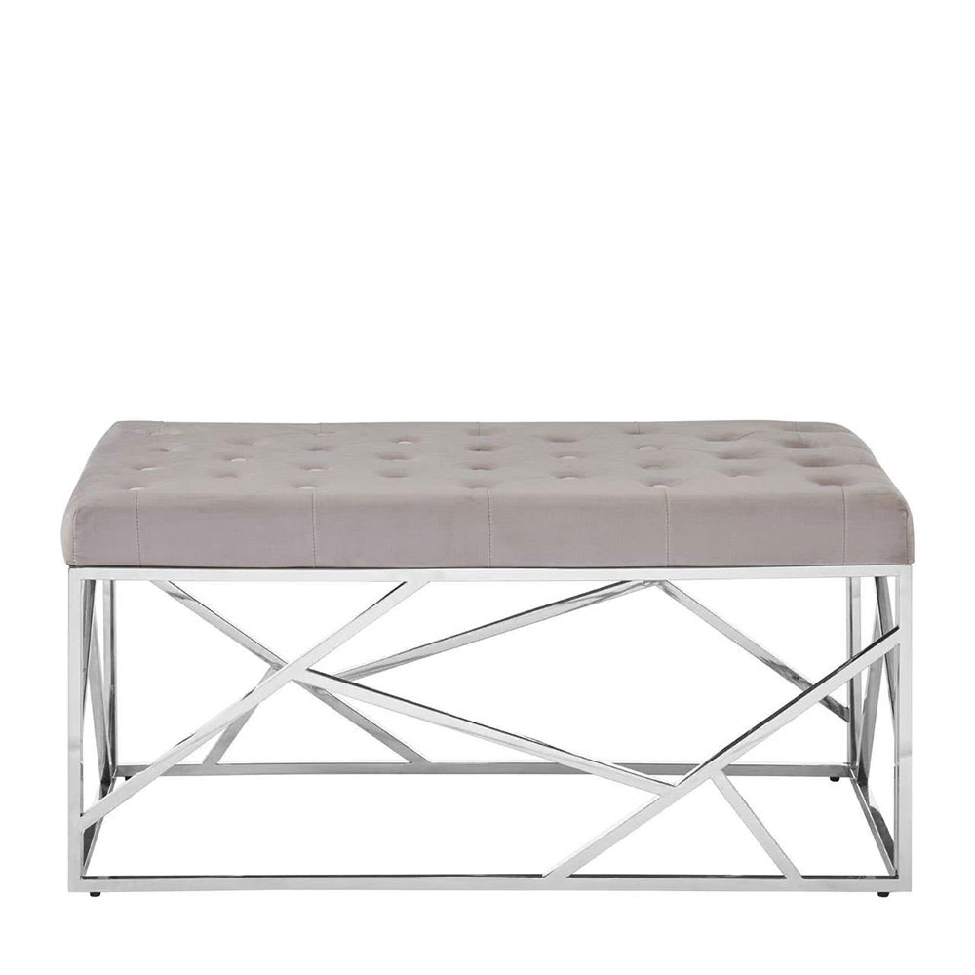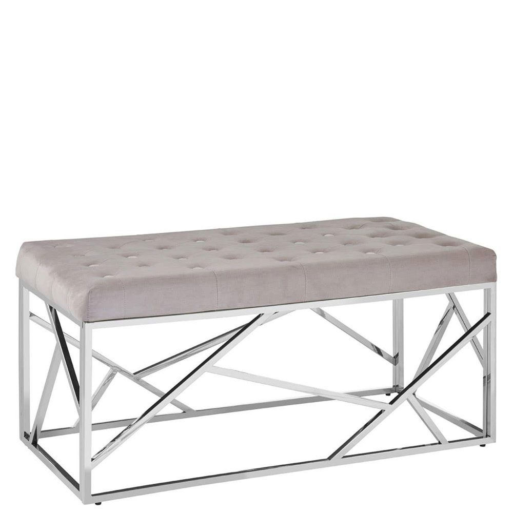 Item Code: 5502608 This elegant Allure asymmetric Hall Bench has a geometric design and upholstered with tactile mink coloured Velvet Fabric.The plump cushion is dressed in soft Velvet Fabric with a button tufted finish that creates a quilted finish. The base is made from smooth stainless steel and boasts a reflective silver finish that complements the upholstery. Angled lines dart across the base